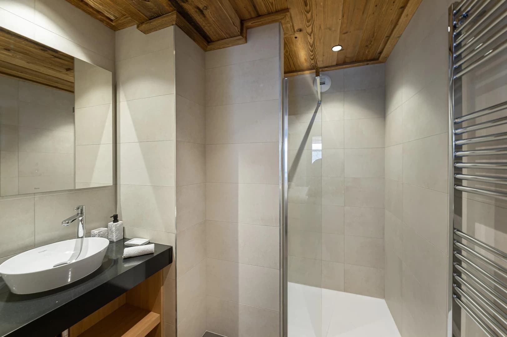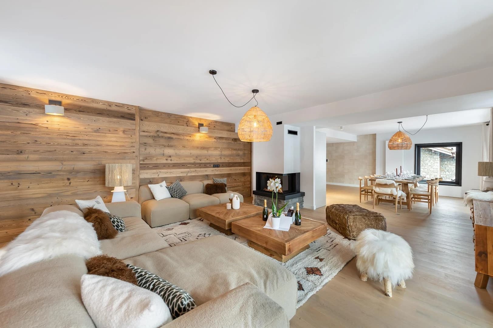 With 158 m² of space, the apartment accommodates up to 10 guests. It offers four bedrooms, three of them en suite, plus a bunk room for four. The 63 m² living area includes a fully equipped kitchen, dining space, and a cosy living room with fireplace opening onto the balcony. Refined chalet-style décor with subtle ethnic touches creates a warm and distinctive atmosphere.