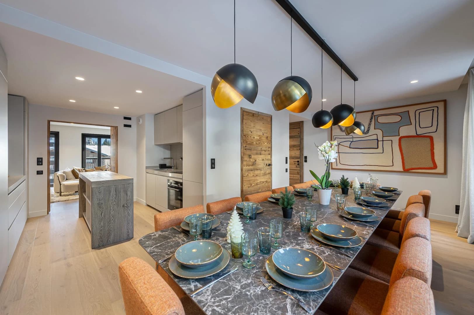 The Altar apartment is a 194 m² triplex accommodating up to 10 adults and 4 children. Spread over three levels, it features six bedrooms, including a children’s room with four beds, ensuring comfort for families and groups. The central floor is dedicated to living spaces, with a generous dining area, a fully equipped kitchen, and a bright living room with fireplace. The refined décor, with pure lines and organic shapes, enhances its contemporary alpine spirit. A private sauna adds a touch of relaxation after a day on the slopes.