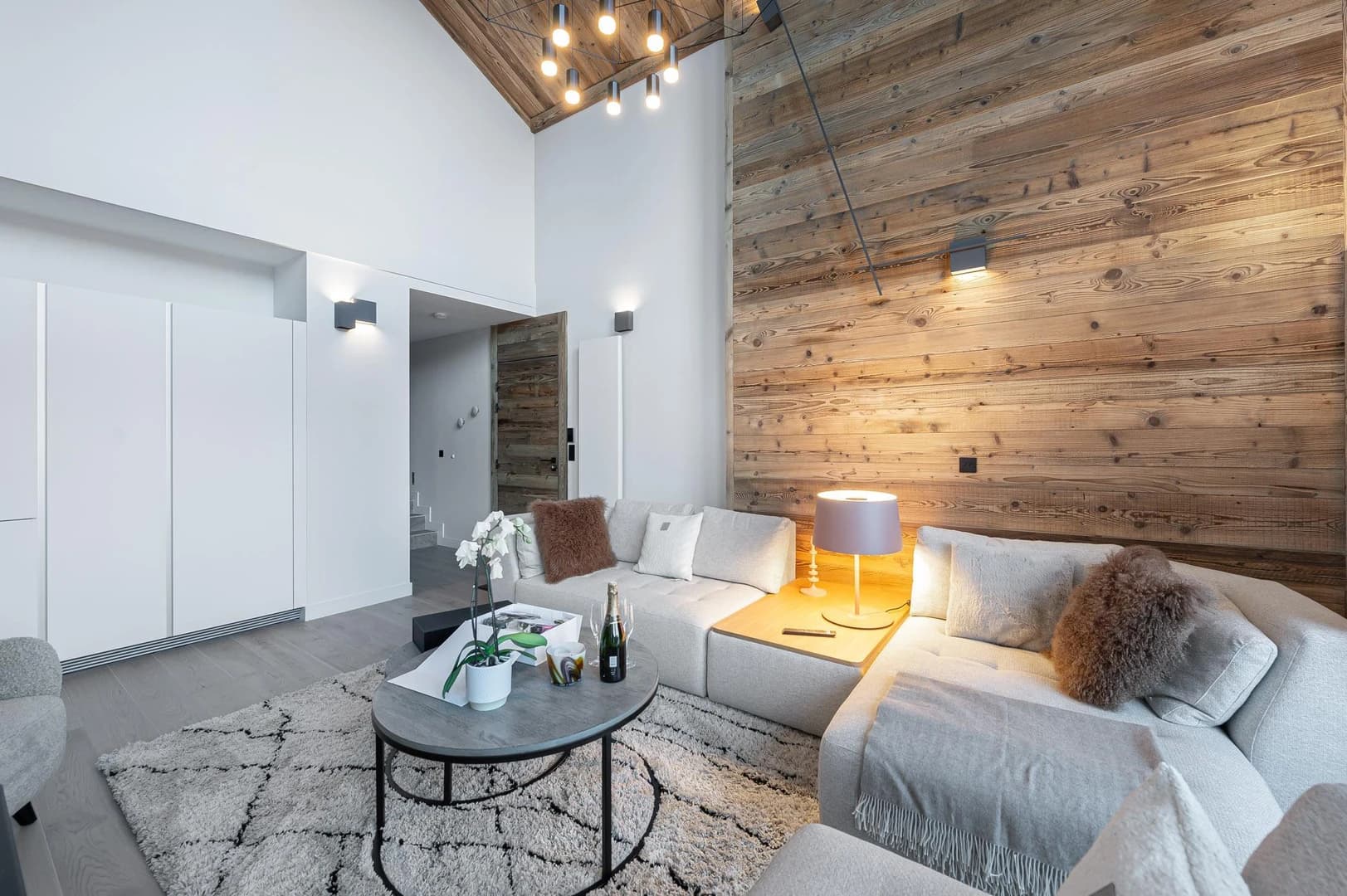 The apartment features four double or twin bedrooms and two bathrooms with walk-in showers, comfortably accommodating families or groups. The spacious living area, with its soaring cathedral ceiling, opens onto breathtaking alpine views through a full glass wall. A double-sided fireplace adds warmth and subtly defines the living spaces. Interiors combine clean lines, natural wood accents, and a soothing palette of muted colors, creating a serene, modern alpine atmosphere. For added relaxation, Alpamayor Illi includes a private sauna.