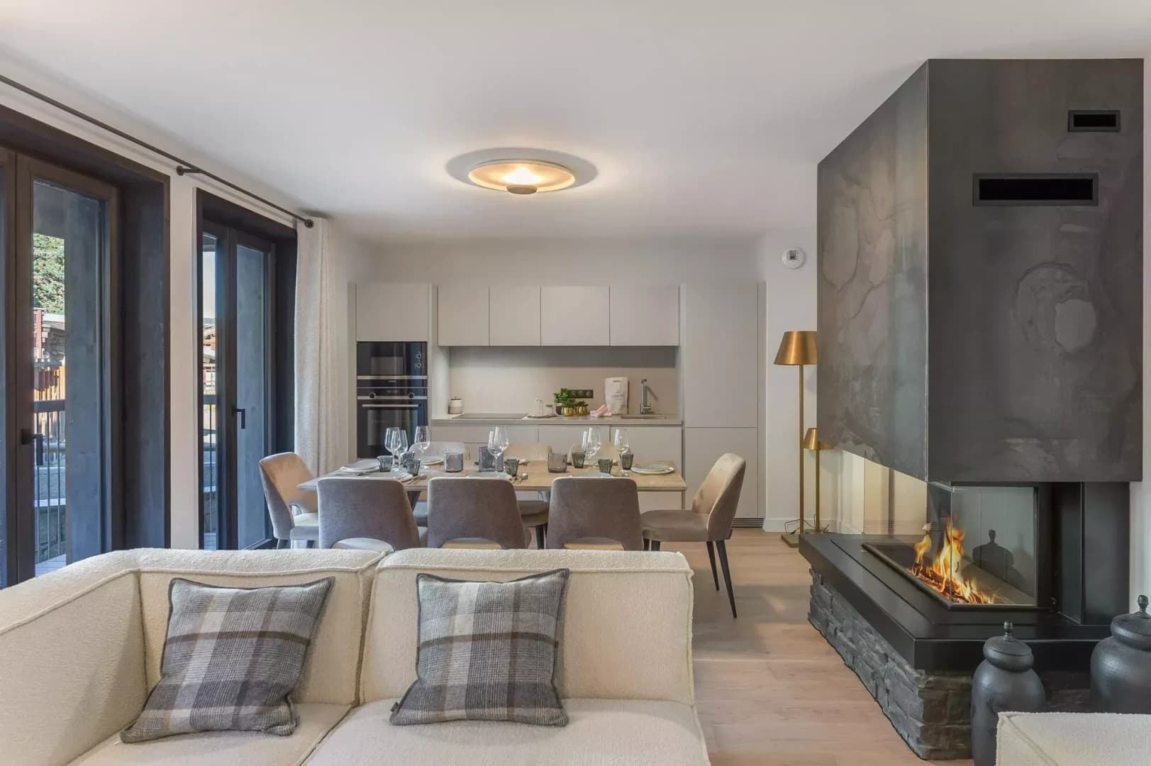 Alpamayor M1 is a stylish duplex apartment featuring four en-suite bedrooms and a spacious open-plan living area with a lounge, dining room, and fully equipped kitchen. The interiors combine softly contoured furniture, plush materials, and a contemporary glass fireplace, creating a warm and relaxing atmosphere after a day on the slopes.