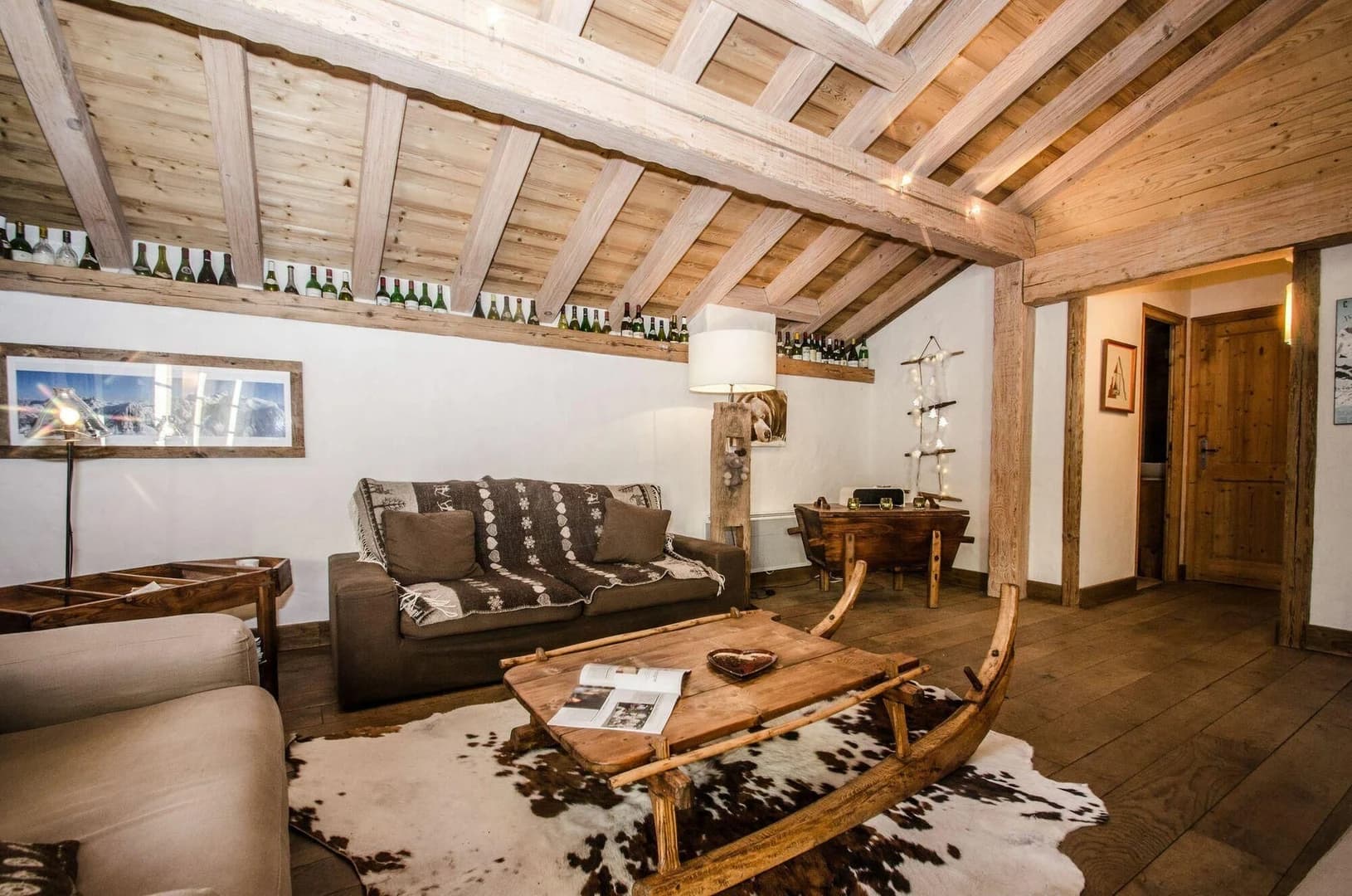 Warm and welcoming, the apartment features traditional wood and stone elements and can comfortably accommodate up to 8 guests across 4 bedrooms. The bright and spacious living room is perfect for gathering, with a decorative (non-functional) fireplace and an open, fully equipped kitchen. Step out onto the south-facing terrace to admire the stunning view of Mont Blanc.