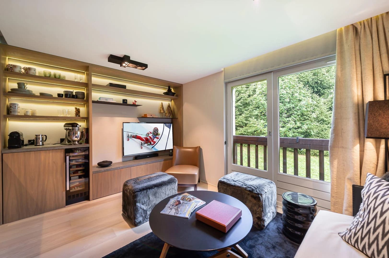 With a modern Alpine design, the apartment is both elegant and functional. It comfortably accommodates 4 guests with a cabin room featuring 2 bunk beds and a sofa bed in the living area. The bright, open space is enhanced by a large bay window that frames the serene, wooded park surrounding the residence, offering a seamless connection to nature.
