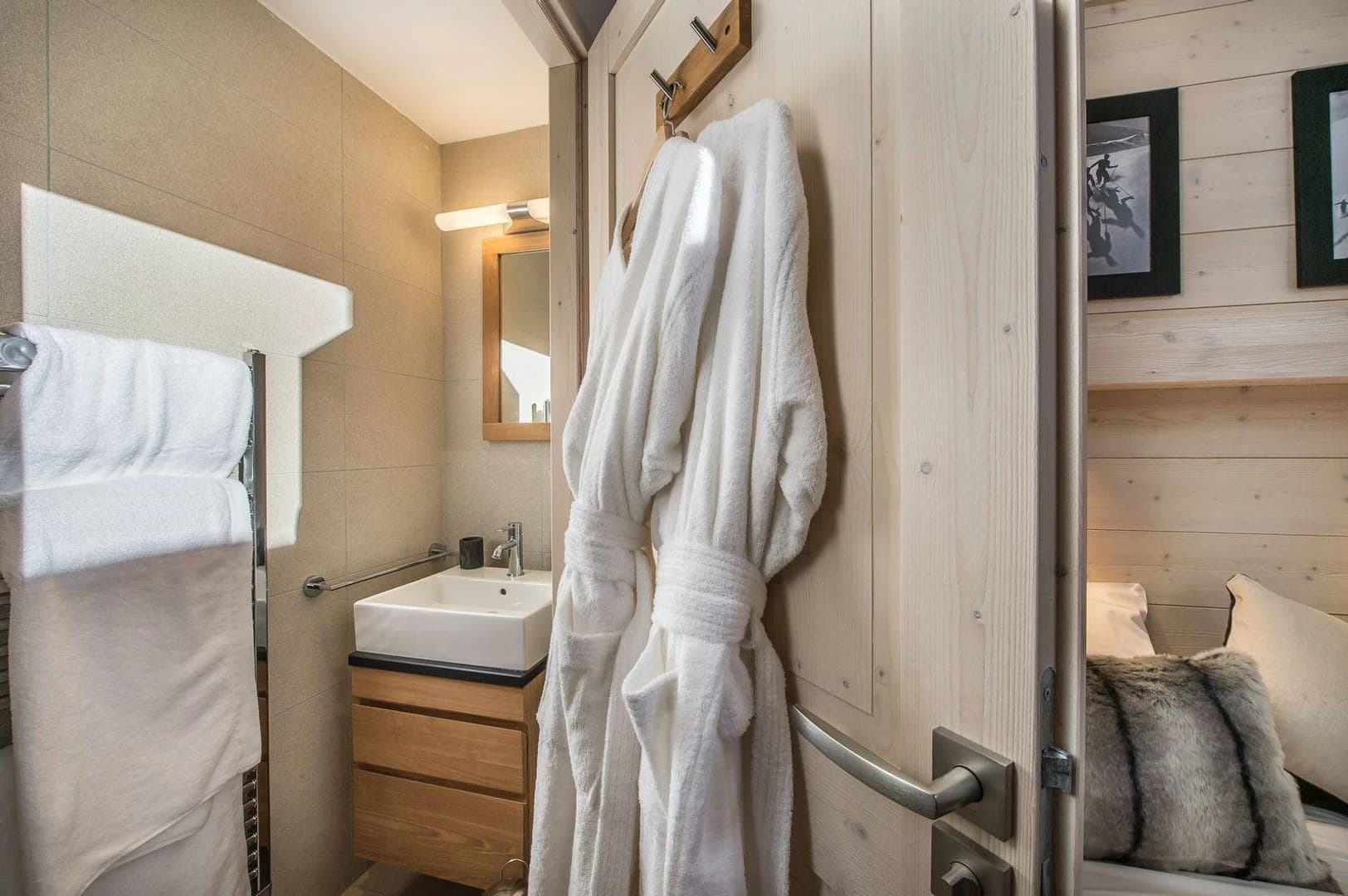Light wood, soft furs, and neutral tones create a warm and inviting atmosphere, perfect for a luxury stay in the 3 Valleys ski area.