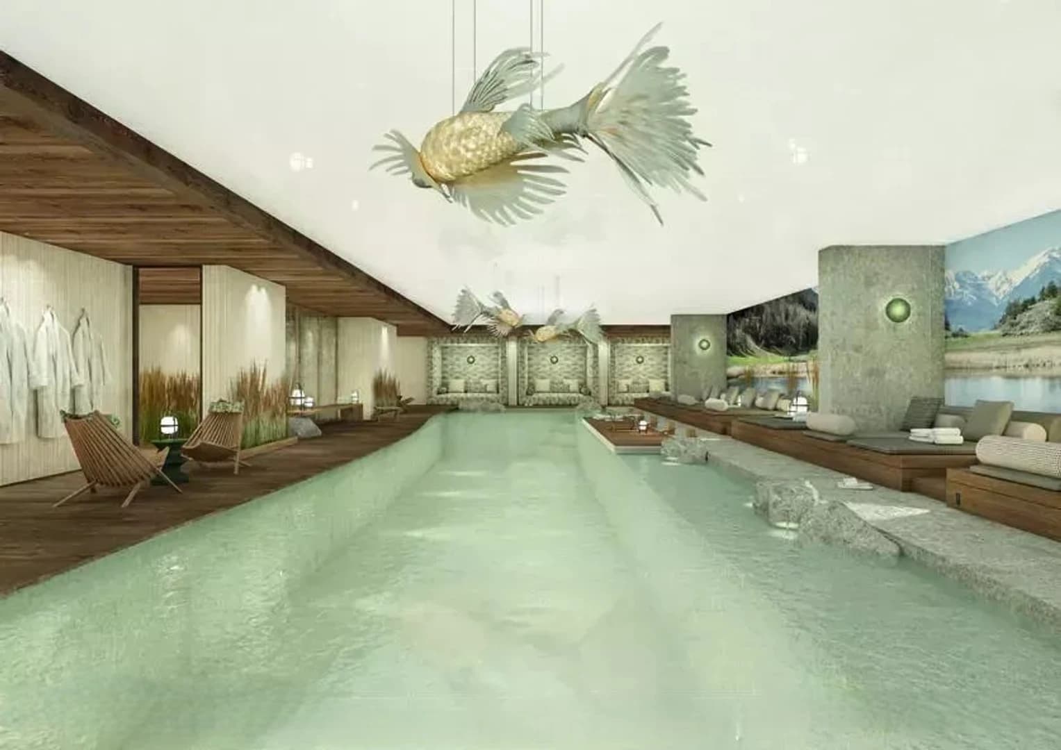 Within its striking wood and glass façade, Atmosphere 1850 combines traditional chalet architecture with contemporary alpine design. Guests enjoy exclusive access to a 22-metre indoor pool, sauna, hammam, sensory shower, fitness/yoga room, herbal infusion bar, and three treatment rooms for bespoke therapies arranged by the concierge.