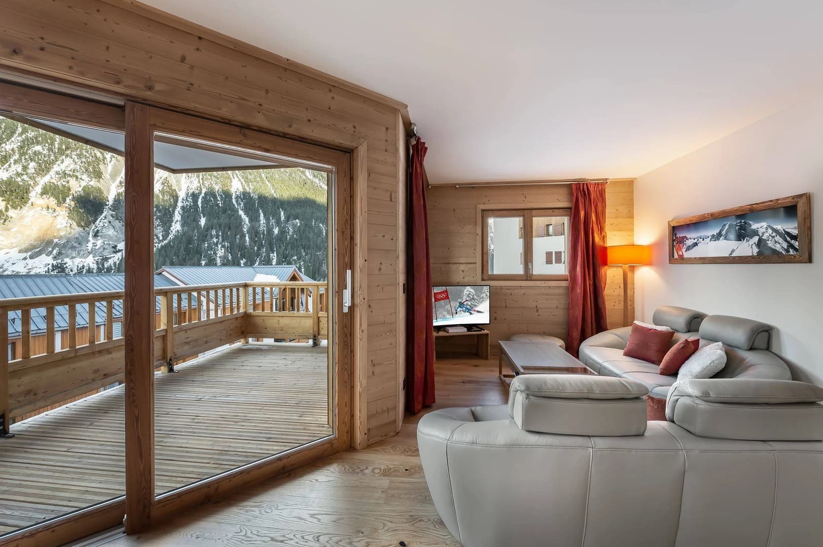 After a day on the slopes, unwind on the spacious balcony while taking in the stunning mountain views a serene spot to end your day in Courchevel Moriond.