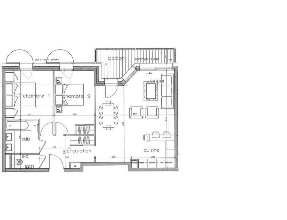 The 66m² apartment comfortably accommodates 4 guests with one double bedroom, one twin bedroom, and a bathroom. The spacious living room exudes a chic mountain atmosphere, featuring a kitchen that opens to the lounge and dining area. Large bay windows fill the space with natural light, and the south-facing balcony offers views of the slopes and Courchevel 1850 peaks.