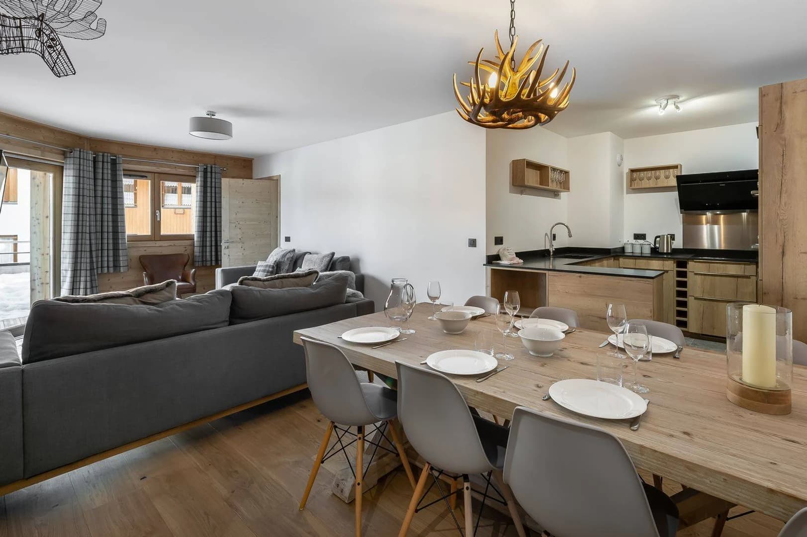 At the garden level of the residence, the Chantemerle RJ04 apartment accommodates up to 4 adults and 4 children in 78m² of space. The sleeping area includes 2 double bedrooms, one with an en-suite shower room, a cabin with 2 bunk beds, and a separate bathroom. The open-plan living area features a lounge, dining space, and fully-equipped kitchen, all leading to a terrace with beautiful views of the Alpine peaks. The interior seamlessly combines traditional mountain charm with modern comforts, with wood accents and soft materials creating a warm and relaxing atmosphere. Your stay at Chantemerle includes a ski locker and a parking space in the residence's underground garage.