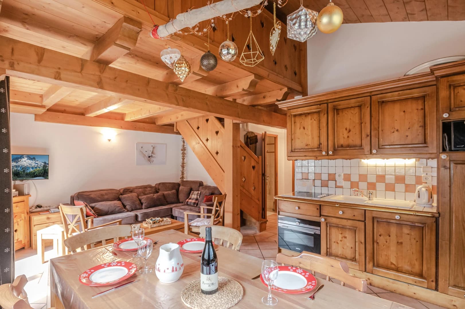 Ideal for families or groups, the apartment comfortably accommodates up to 8 guests with three spacious bedrooms and an enclosed mezzanine. The first level features a bright living and dining area, a fully equipped kitchen, and a balcony offering stunning views of Mont Blanc. Two bedrooms, including one with a private shower room, and a separate bathroom complete this floor. The upper level offers an additional bedroom and an enclosed mezzanine sleeping area.