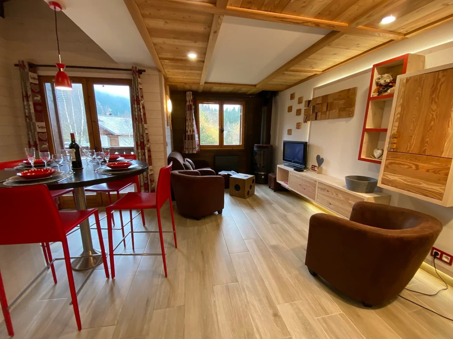 The living space includes a fully equipped kitchen, dining area, and a lounge with a wood stove perfect for unwinding after a day on the slopes. The apartment also boasts a balcony with a lovely view of Mont Blanc. A game room on the second floor with board games and a retro gaming console adds a fun and relaxing touch for guests.