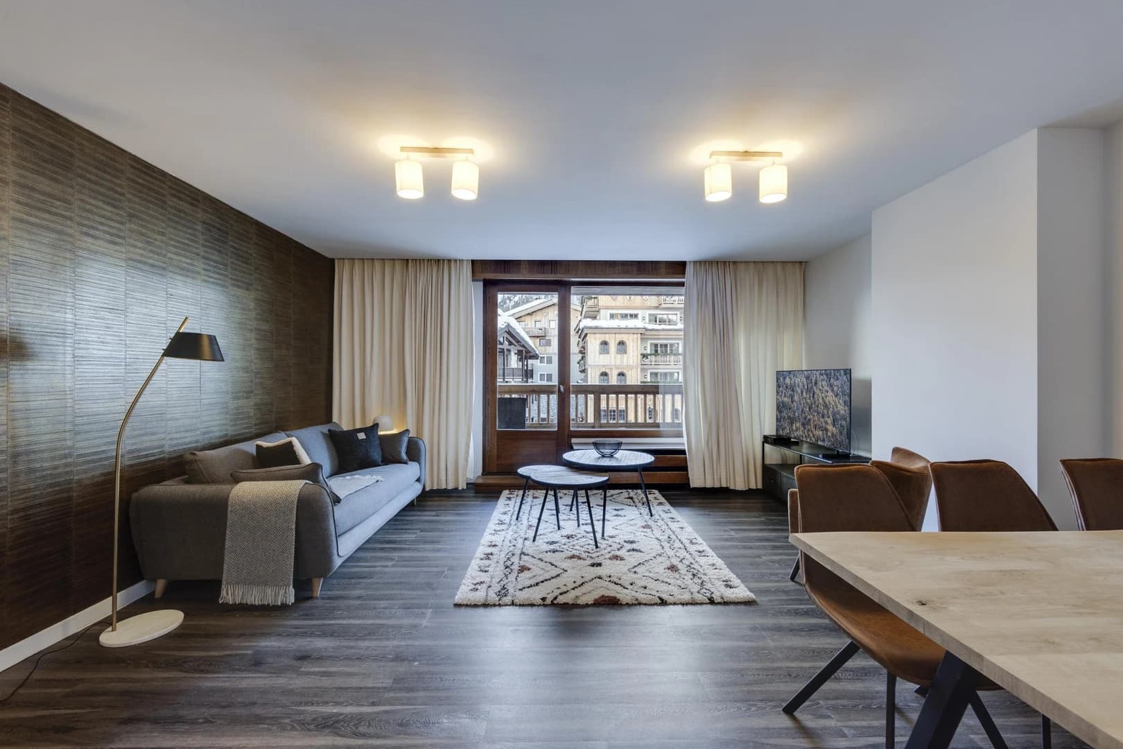 The Grand Paradis 24 apartment is a beautiful 53 sqm space located in a prime spot at the base of the ski slopes. Designed with a pure modern aesthetic, it offers a spacious living room with a dining area, a semi-open kitchen, a bathroom, a double bedroom, and a dressing room. A convertible sofa in the living room provides additional sleeping space for two.