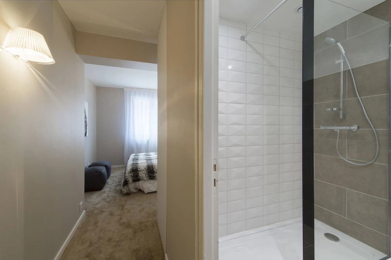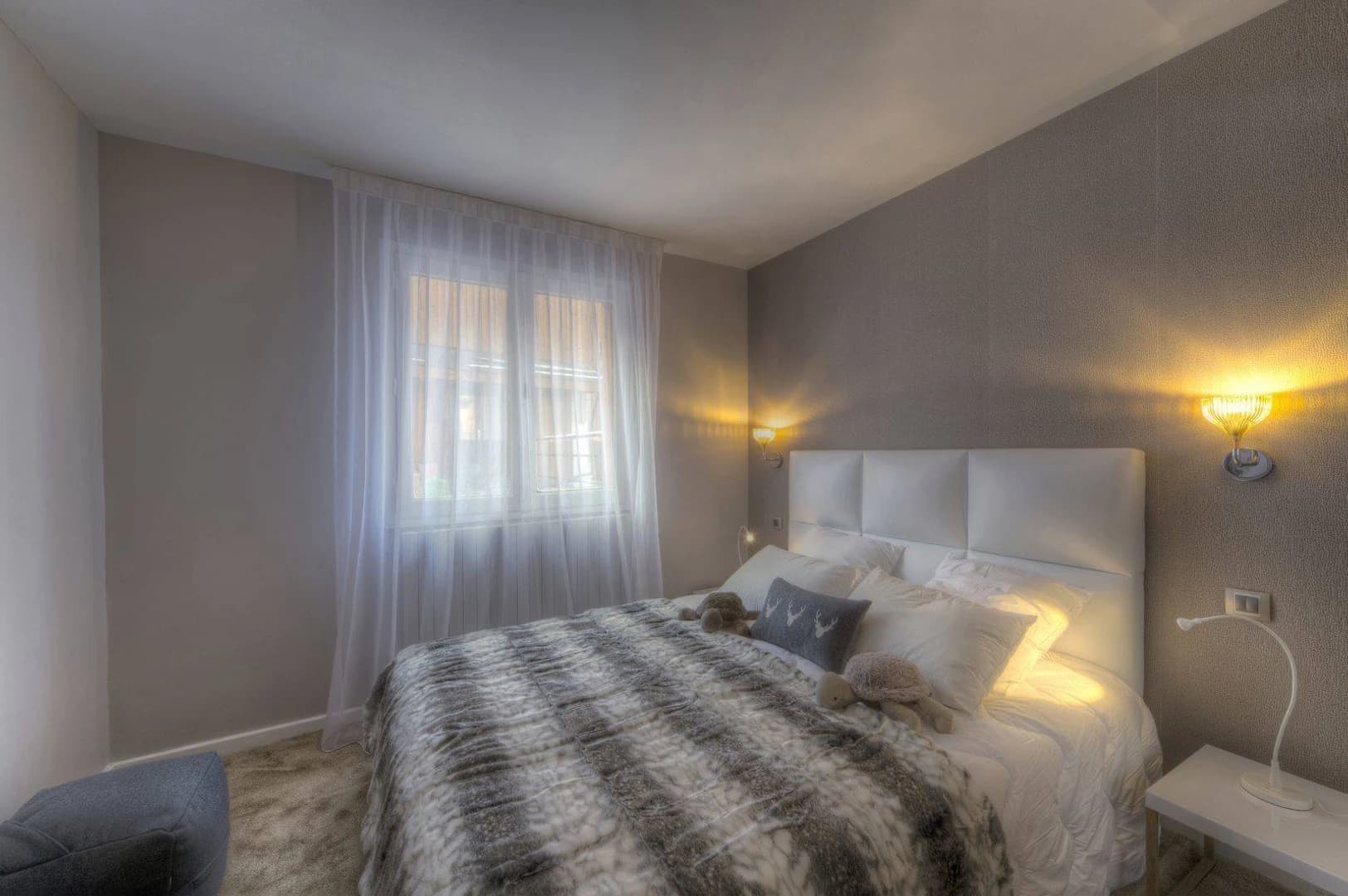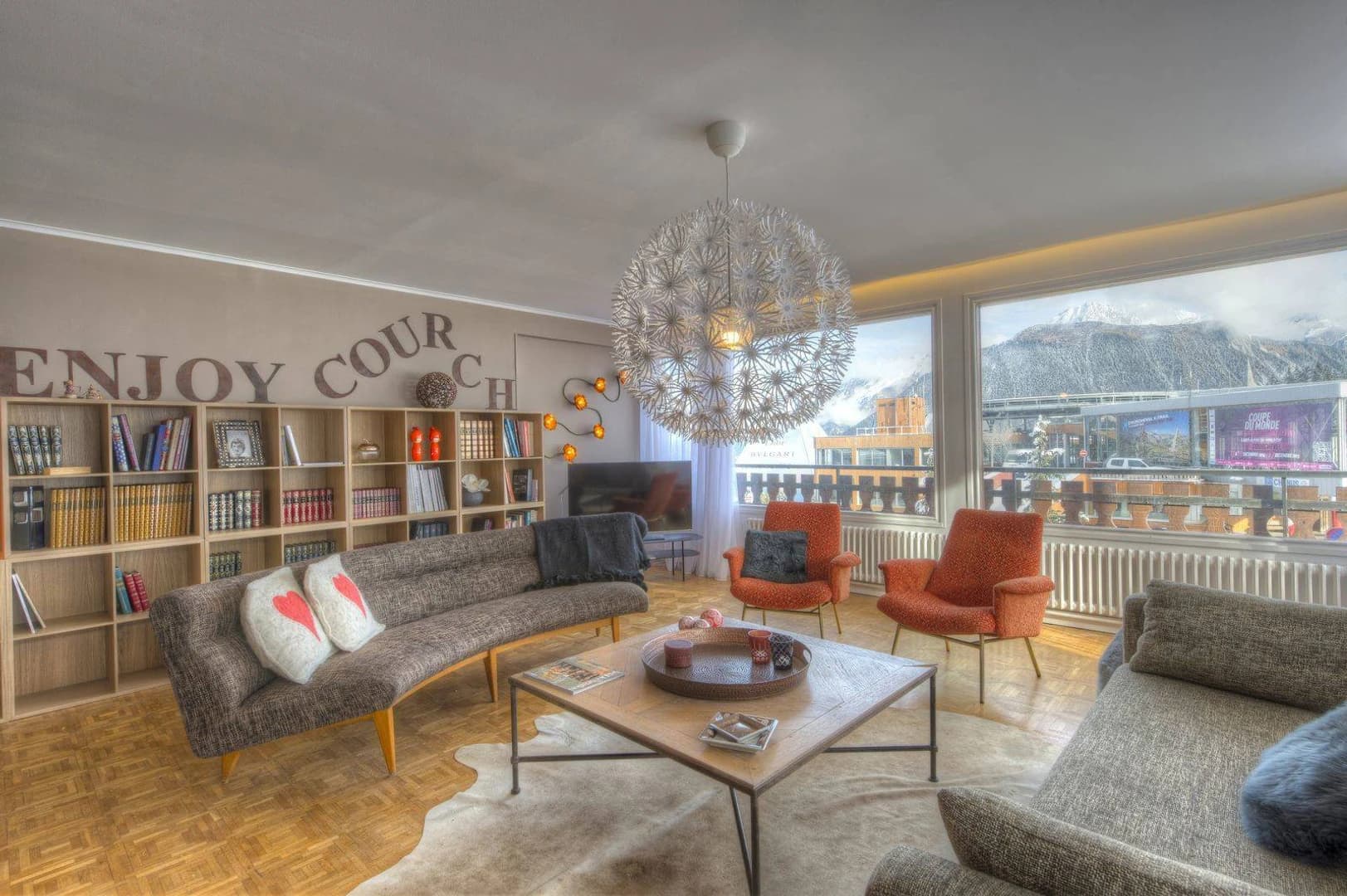 Accommodating up to eight guests, the apartment features four en-suite bedrooms, including double and twin rooms, ensuring both privacy and comfort. The spacious living area is perfect for gathering, with grey sofas and burnt-orange velvet armchairs positioned around a striking stone fireplace. The adjacent dining area, with its large wooden table, invites guests to share delicious meals prepared in the fully equipped kitchen. In the mornings, a dedicated breakfast nook offers the perfect spot to fuel up before hitting the slopes.