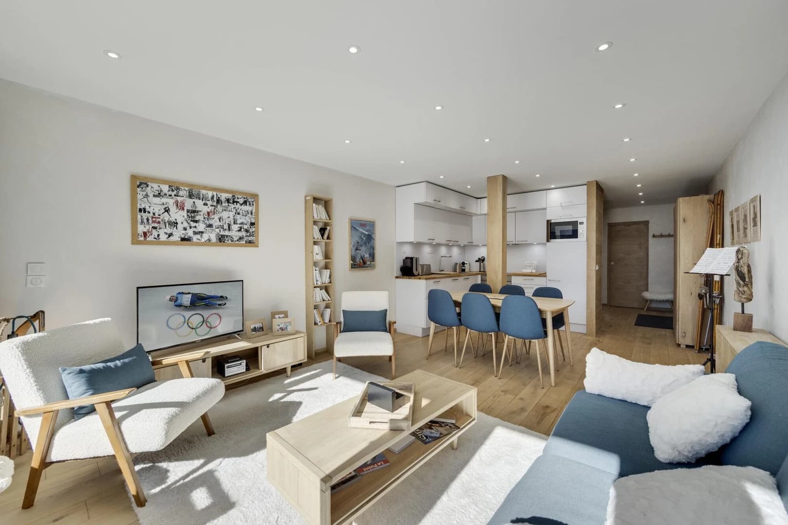 With 53 m² of thoughtfully designed space, it comfortably accommodates up to 4 guests in one double bedroom and one twin bedroom. The apartment is bathed in natural light, thanks to its south-east exposure and expansive bay window that opens into a welcoming living area. The minimalist design featuring white walls and light oak panelling creates a calming, cozy atmosphere, ideal for relaxing after a day on the slopes.