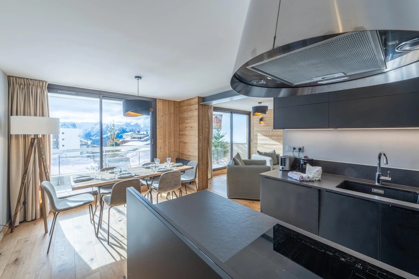 With its south-facing orientation, the apartment is filled with natural light throughout the day. The large living area features several plush sofas and a panoramic bay window framing stunning views of the surrounding mountains.
