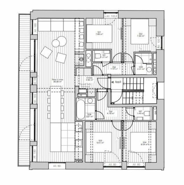 Spanning 93 sqm, the apartment welcomes up to 8 guests across 4 double bedrooms. It features a separate bathroom, a shower room, and two independent toilets, offering comfort and privacy for families or groups of friends. The open-plan living space with a fully equipped kitchen, dining area, and a cosy lounge centered around a fireplace creates the perfect ambiance for shared moments. The interior combines authentic Alpine charm with modern elegance through the use of aged wood, grey stone, ambient lighting, and flannel tones.
