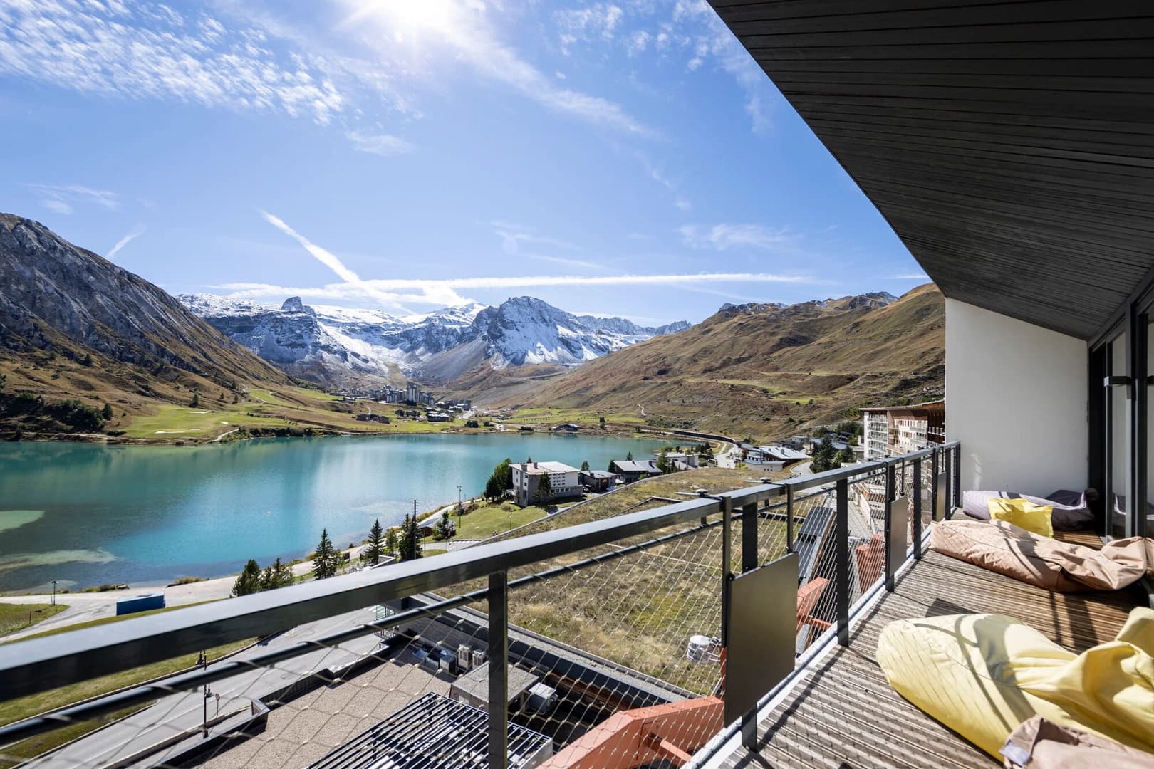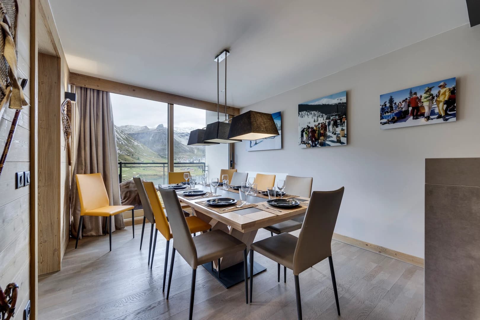 Designed for comfort and conviviality, the apartment features a fully equipped open-plan kitchen, a dining area, and a cozy lounge with two sofa beds, armchairs, and Apple TV. The large south-facing balcony invites you to unwind with panoramic views of Lac de Tignes and the surrounding peaks of Tovière and Grande Motte.