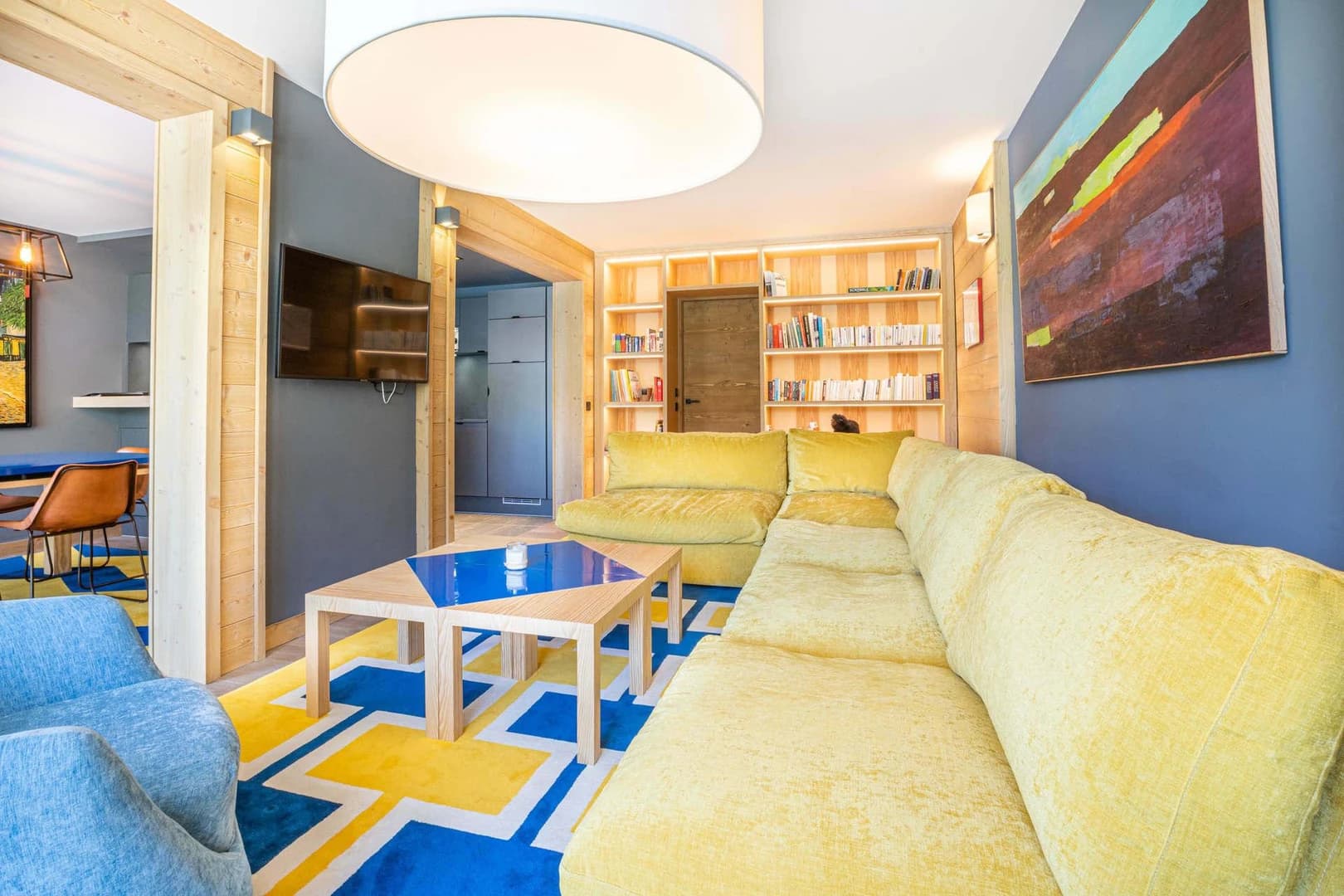 Designed to comfortably host up to 7 guests, the apartment features a modern kitchen that opens onto the dining area, where you’ll enjoy unobstructed mountain and lake views. The generous living room is perfect for relaxing with its large sofa and flat-screen TV.