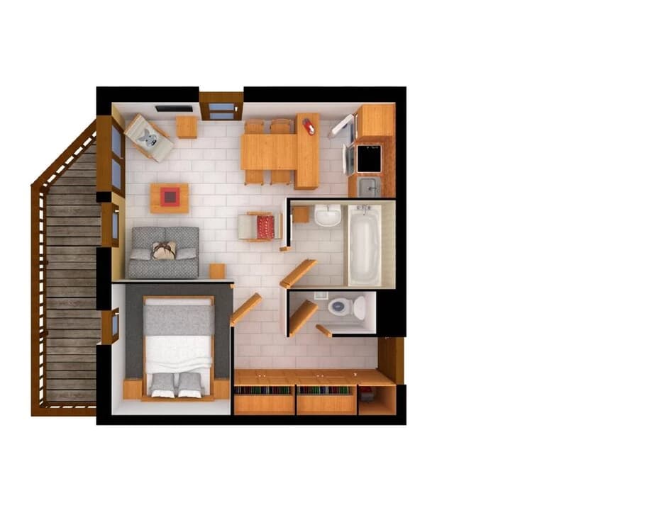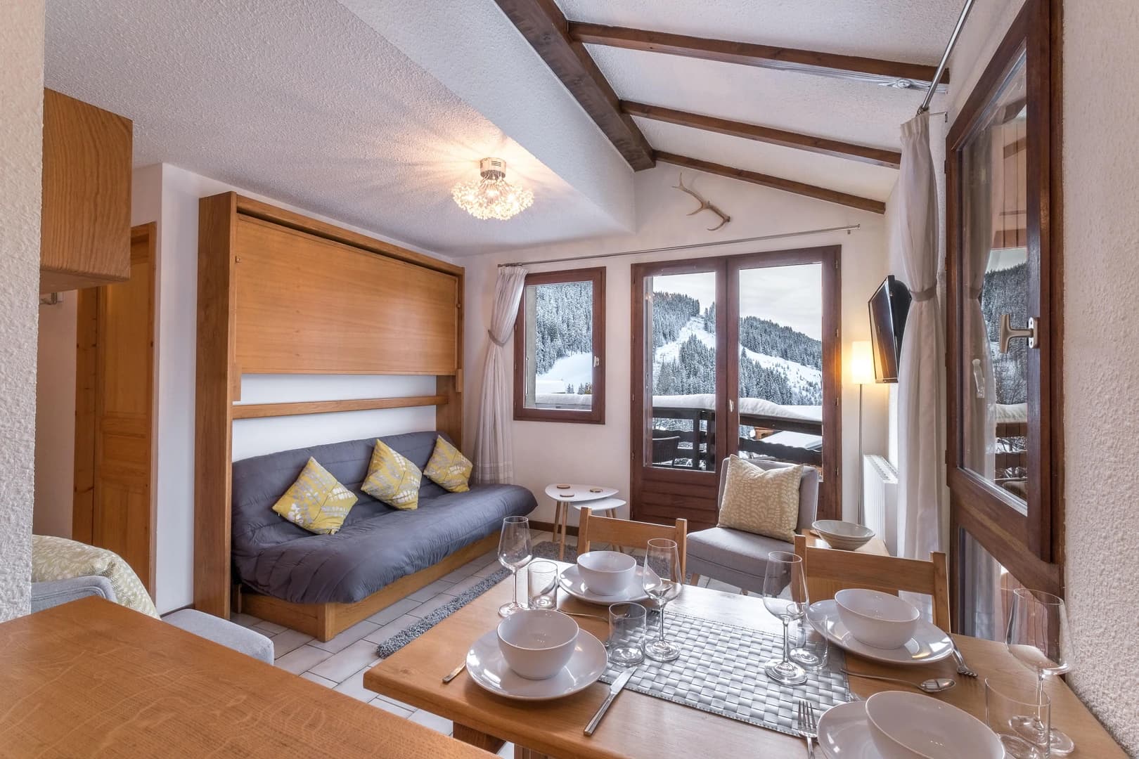 Primevères 2 is a charming two-room apartment located on the first floor of a residence in Courchevel Moriond. Just steps from the “Le Petit Moriond” ski lift and close to the village shops, its location is both convenient and scenic.