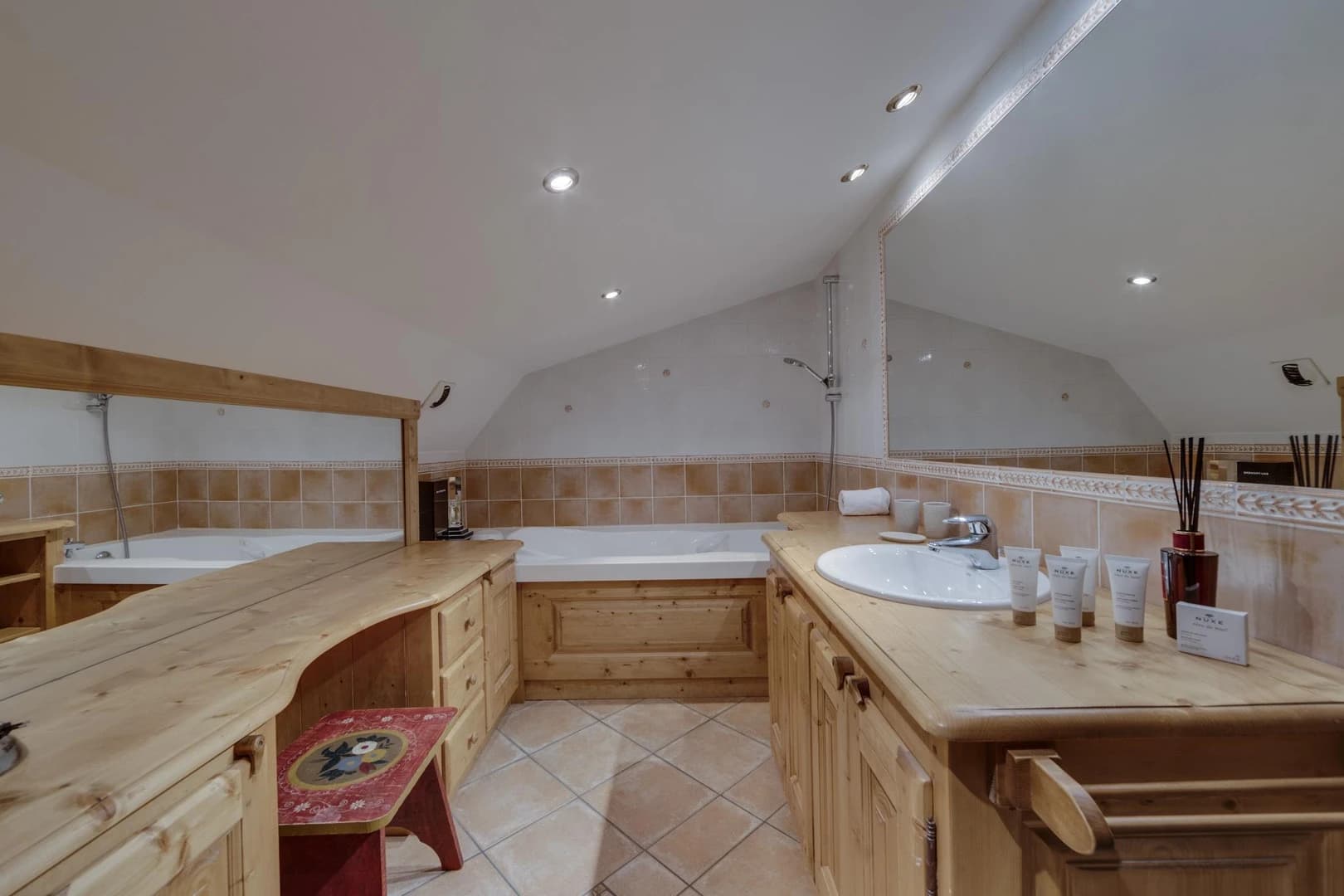 This fourth-floor apartment features four bedrooms: two en-suite rooms on the lower level and two upstairs rooms that share a bathroom. The living space is bathed in natural light thanks to its southwest-facing orientation, while the fireplace invites you to unwind after a day on the slopes.