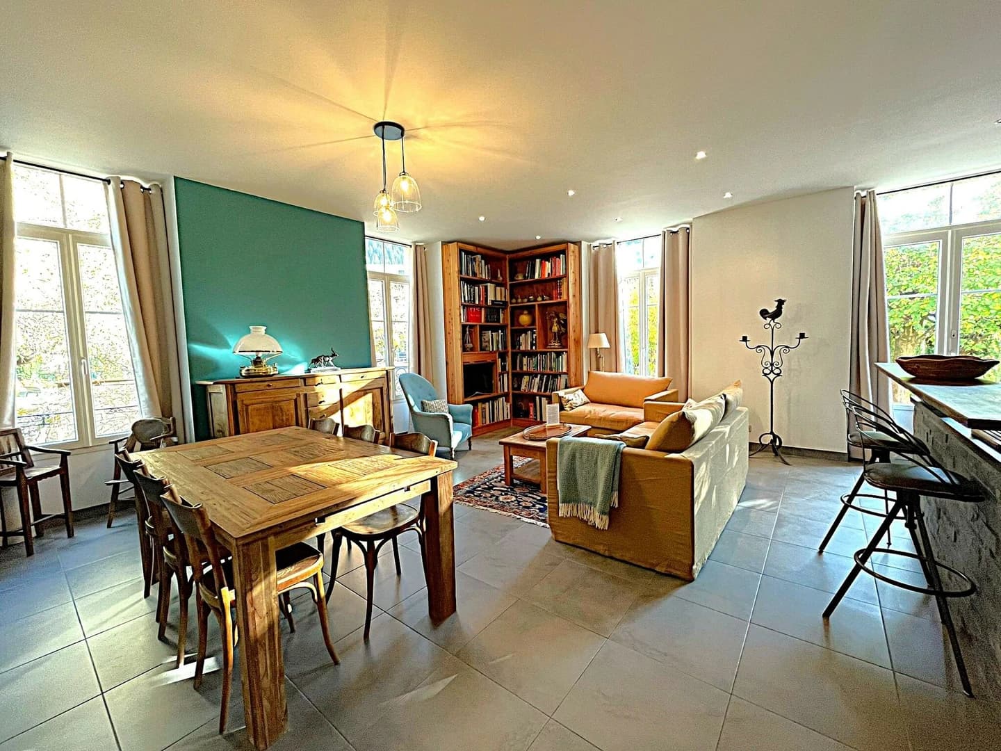 This apartment beautifully combines authenticity and modern comfort, offering a warm, inviting atmosphere. High ceilings, wooden accents, and antique furnishings add character, while large bay windows and southwest exposure flood the space with natural light.