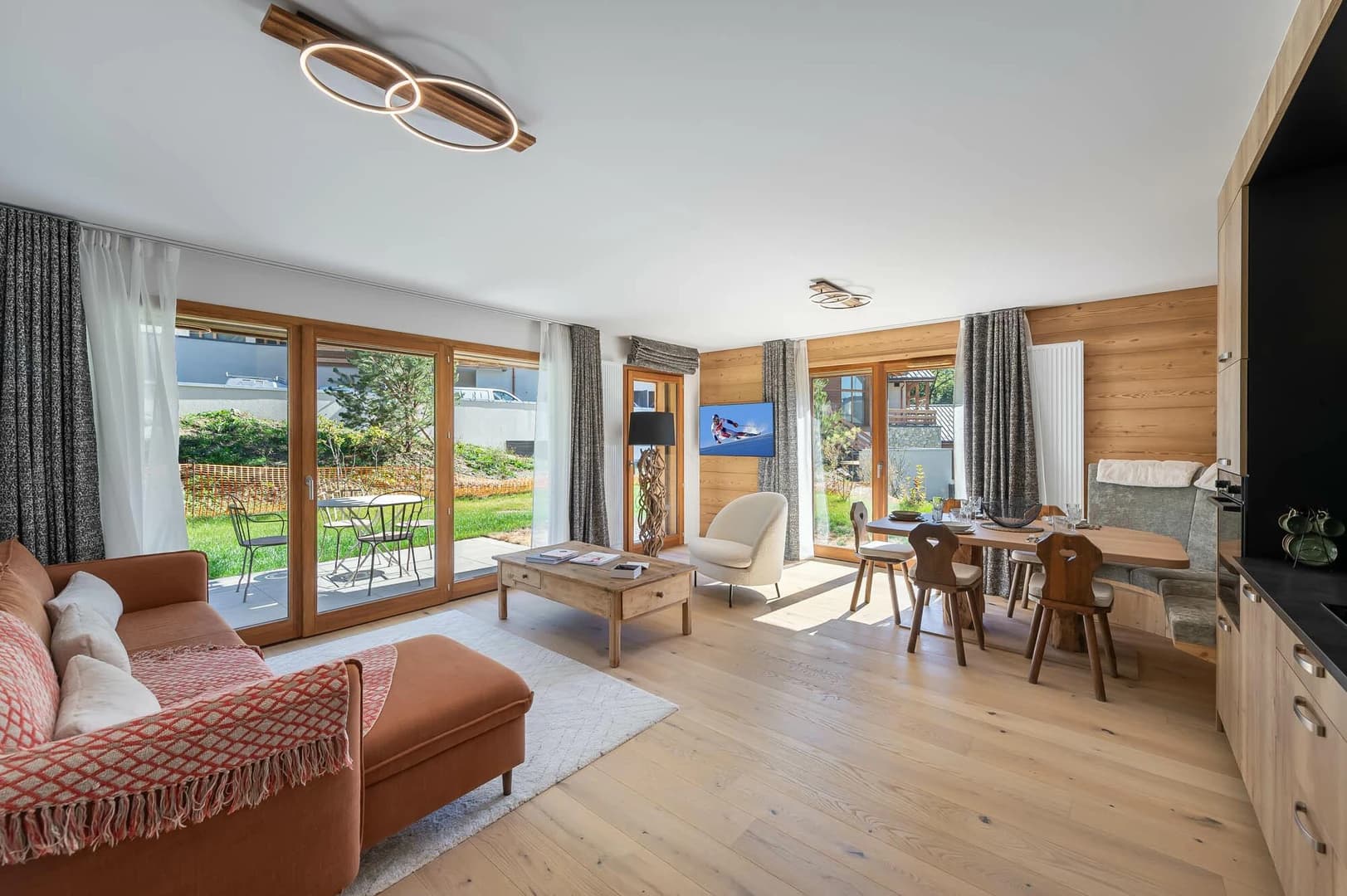 The apartment features tasteful decor and a soothing atmosphere, offering a cozy double bedroom and a spacious children's room with four single beds. It has a separate bathroom and an open-plan living space, accommodating up to six guests (four adults and two children). The living room, filled with natural light, includes a TV corner ideal for relaxing after a day of skiing or exploring in the summer. This area opens directly onto a terrace, allowing guests to enjoy the fresh mountain air in a serene setting.