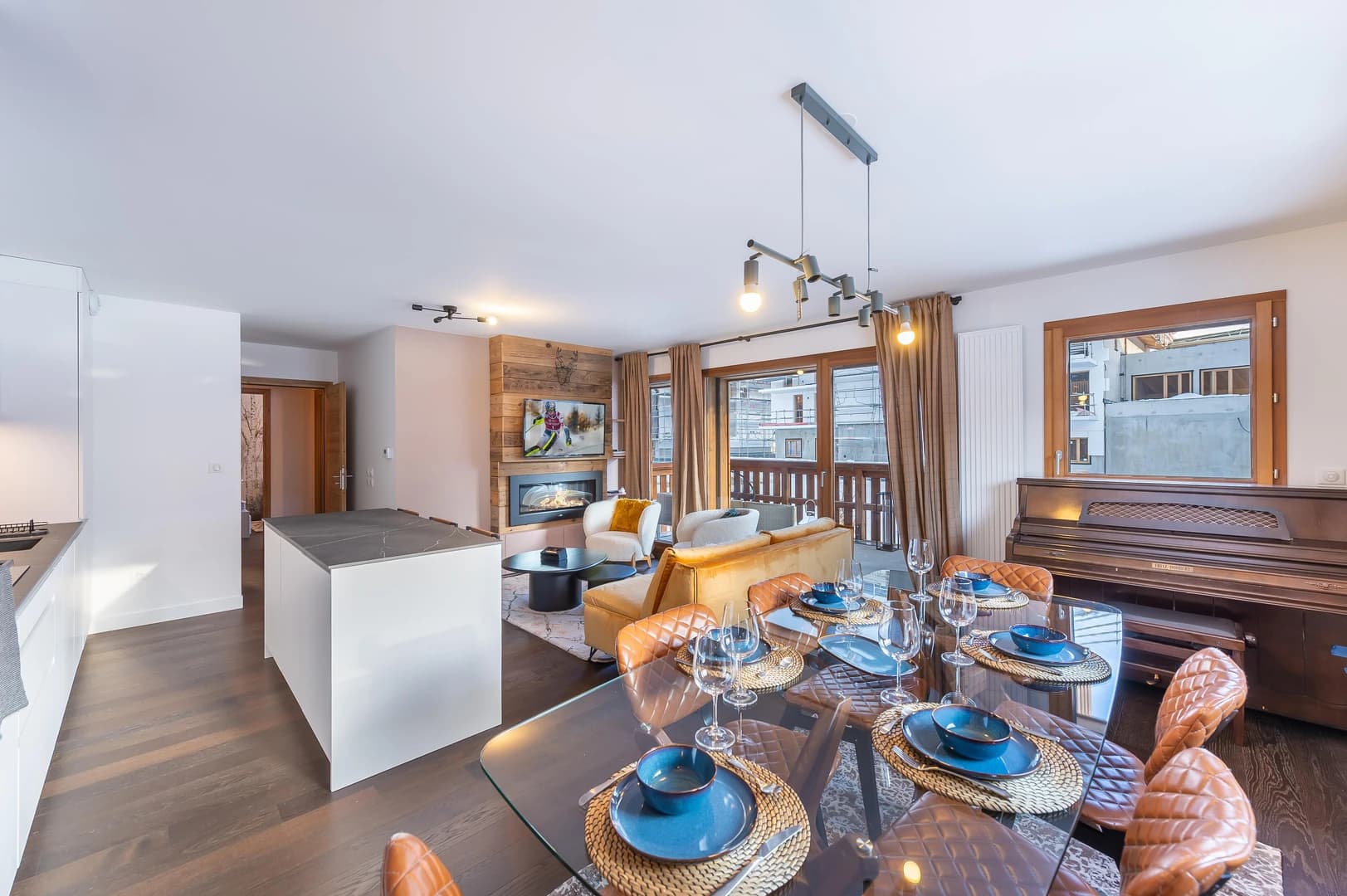Spanning 74 sqm, the apartment comfortably hosts up to 5 guests. The living area features a fully equipped kitchen with a central island, a cozy lounge with a fireplace, and a dining space that opens onto a generous balcony perfect for soaking up the views on sunny days. A piano adds a special touch for music lovers, setting the tone for cozy evenings indoors.