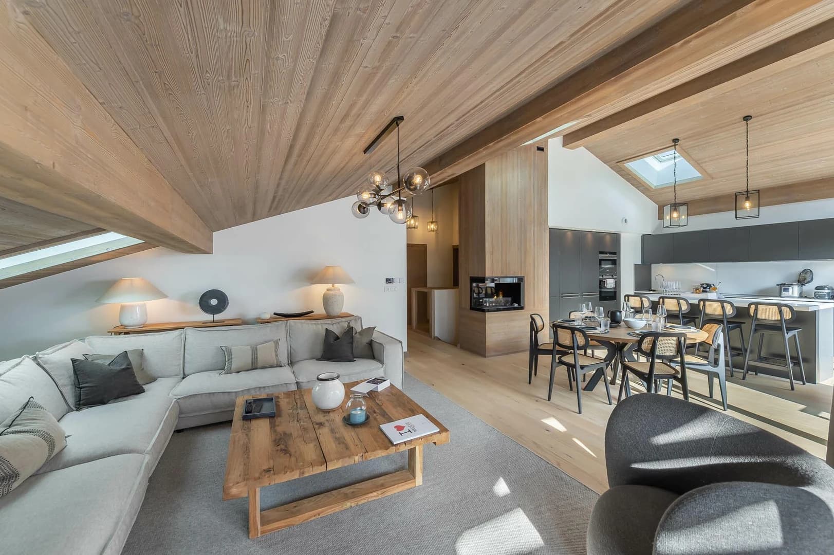 Perched atop the prestigious Stallion Residence in the Rochebrune area, Penthouse Stallion A21 is a splendid 130 m² retreat filled with natural light, thanks to its floor-to-ceiling windows and vaulted ceilings. This space beautifully blends elegance with alpine comfort, featuring a lounge area with a TV, a stylish dining area, and a fully equipped open-plan kitchen, all adorned with soft hues and aged-wood accents.