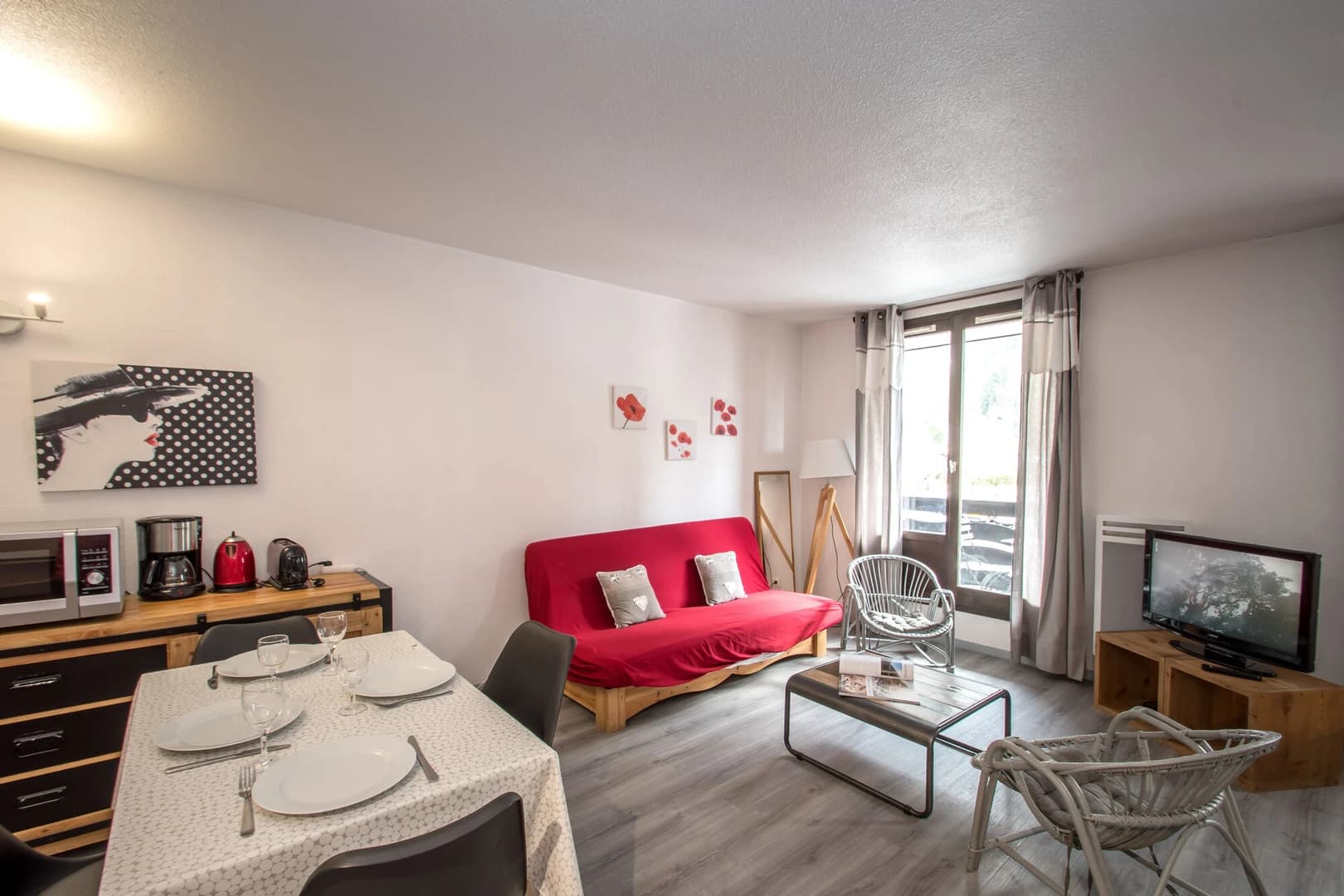 With a surface area of 36 sqm, this inviting apartment can accommodate up to 4 guests, featuring a double bedroom and an additional sleeping corner. The open-plan kitchen is fully equipped and connects to the bright living room, creating a welcoming space to relax after a day on the slopes or exploring Chamonix. A bathroom with a bathtub completes the layout, perfect for unwinding.