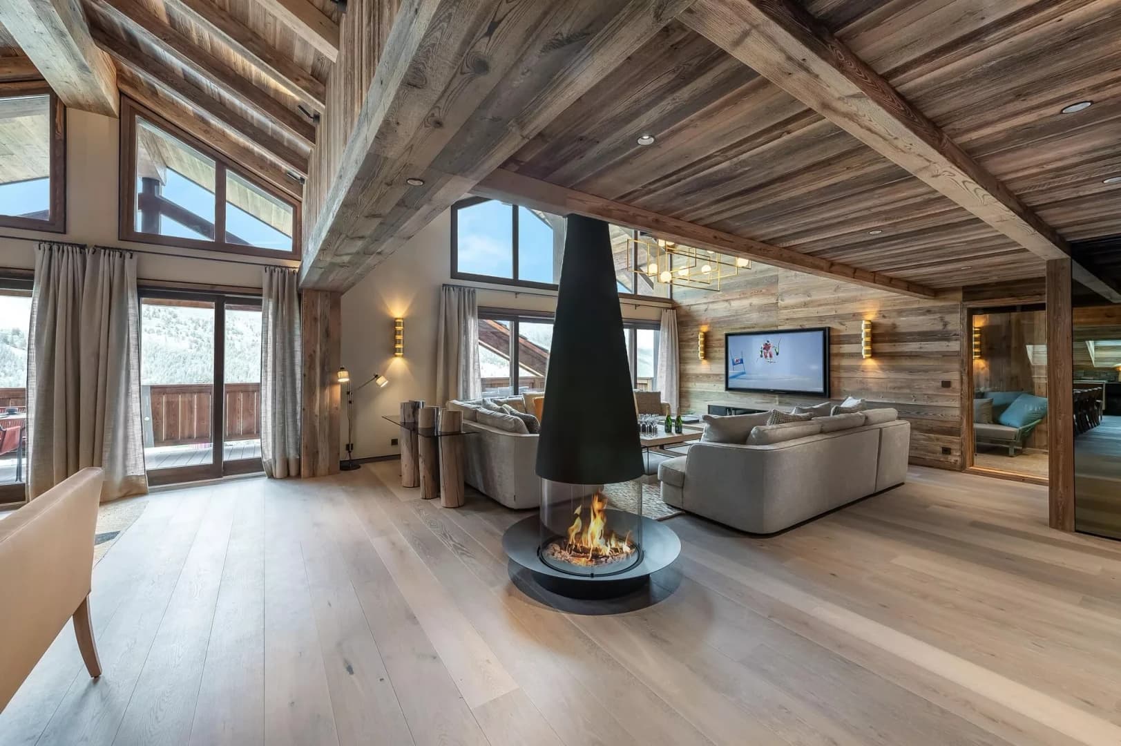 This exceptional alpine retreat features 5 elegant en-suite double bedrooms and a spacious family room with two single beds and a sofa bed for two. The soaring double-height ceilings, floor-to-ceiling glass walls, and refined wooden finishes create an atmosphere of airy sophistication, while the central fireplace and plush sofas add warmth and charm. A large terrace with multiple seating areas invites you to unwind and soak in the spectacular surroundings.