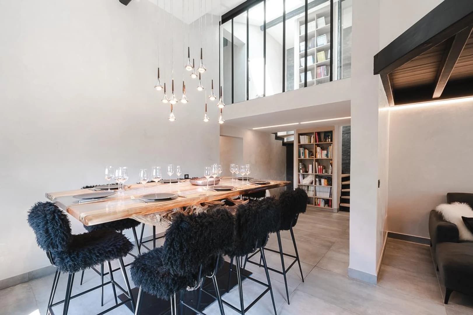 The interior features a minimalist design where clean white tones are accented by elegant black lines. The open-plan layout seamlessly connects the living room, dining area, and fully equipped kitchen with a convenient breakfast bar, each space offering a sense of privacy thanks to clever half partitions. A large covered terrace invites you to soak in the beauty of the Mont Blanc range.