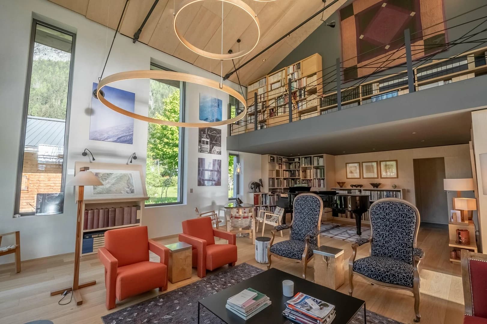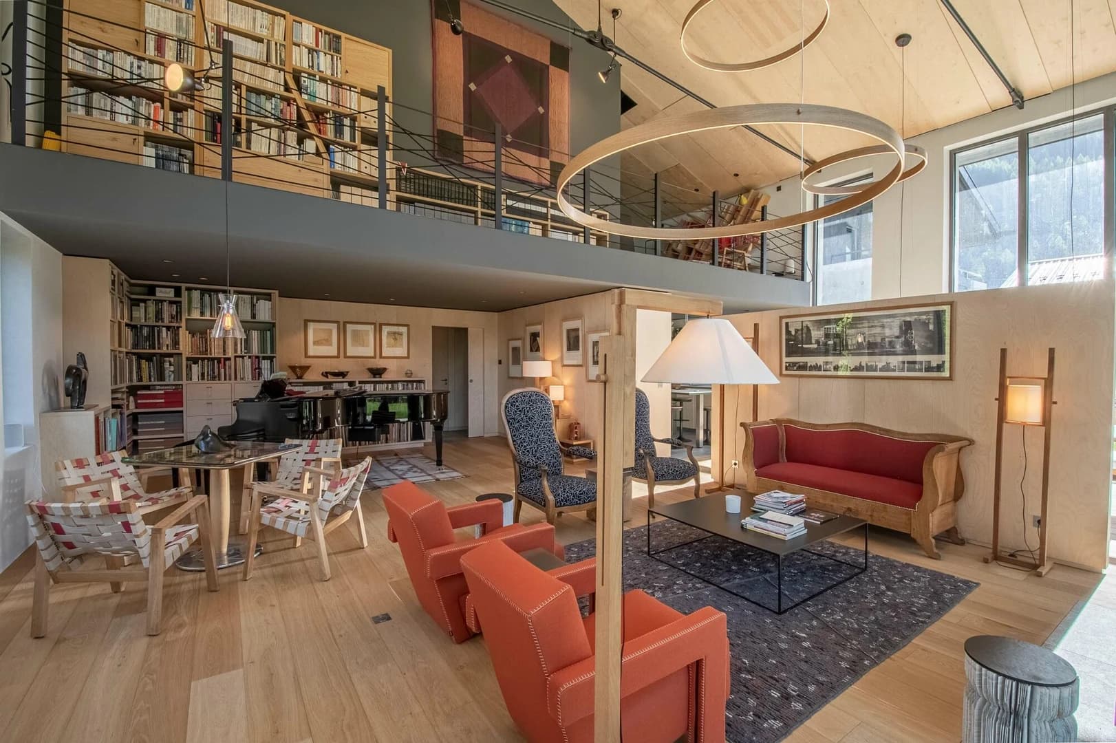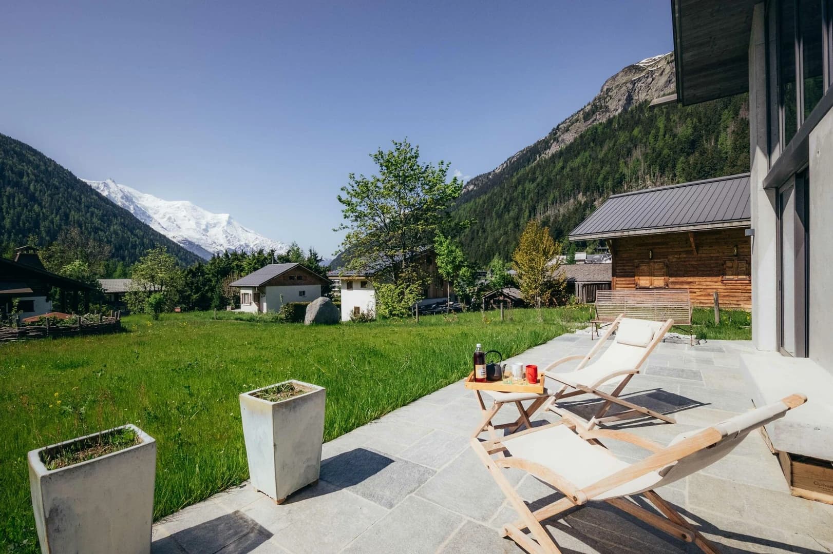 Thanks to its fully glazed façade, the living area is bathed in natural light and offers panoramic views stretching from the Aiguille du Midi to Mont Blanc and the Glacier des Bossons. A piano, available upon request, adds an artistic touch to the space. In summer, the living areas extend seamlessly onto the terrace and garden, enhancing the indoor-outdoor experience.