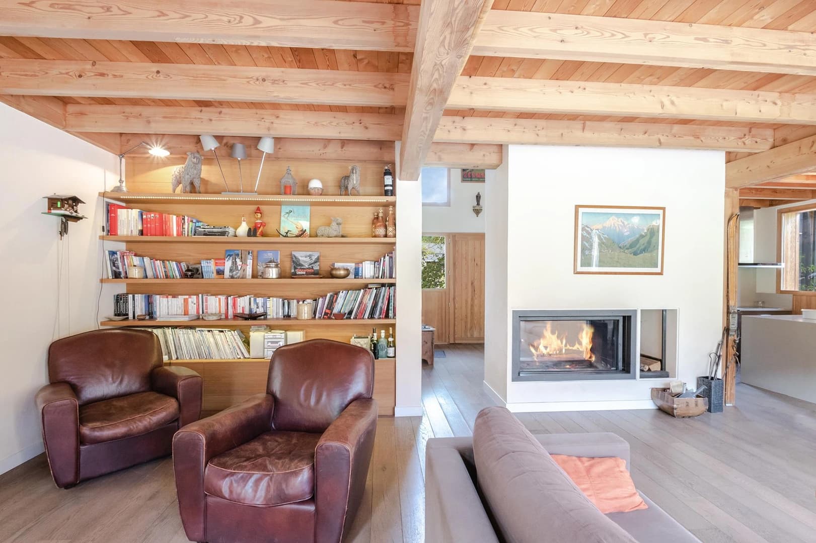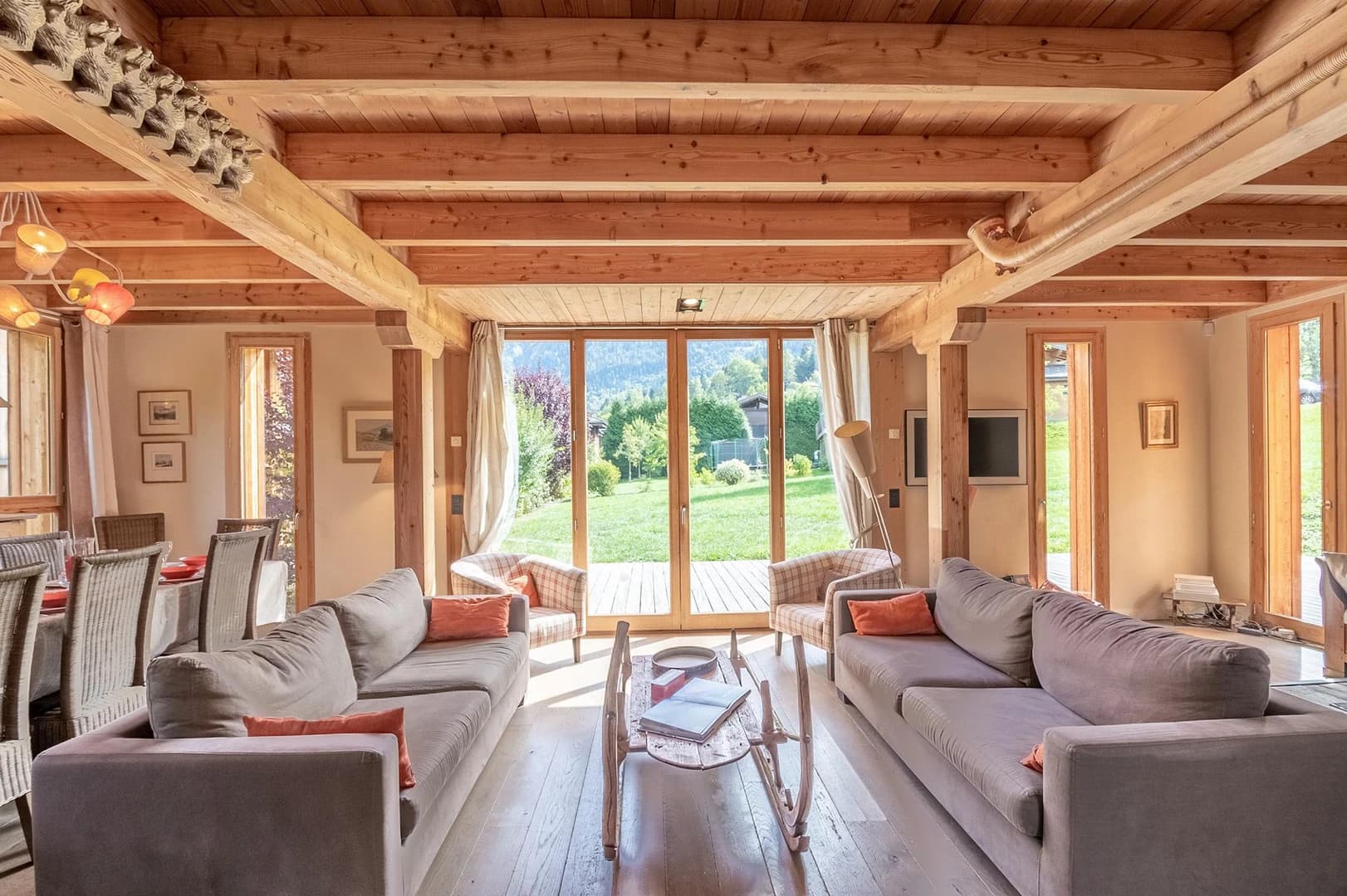 Blending traditional architecture with modern elegance, the chalet showcases beautiful woodwork that complements its stylish décor. The spacious and light-filled living area, centered around a cozy fireplace, creates the perfect setting for relaxing evenings with family and friends after a day on the slopes.