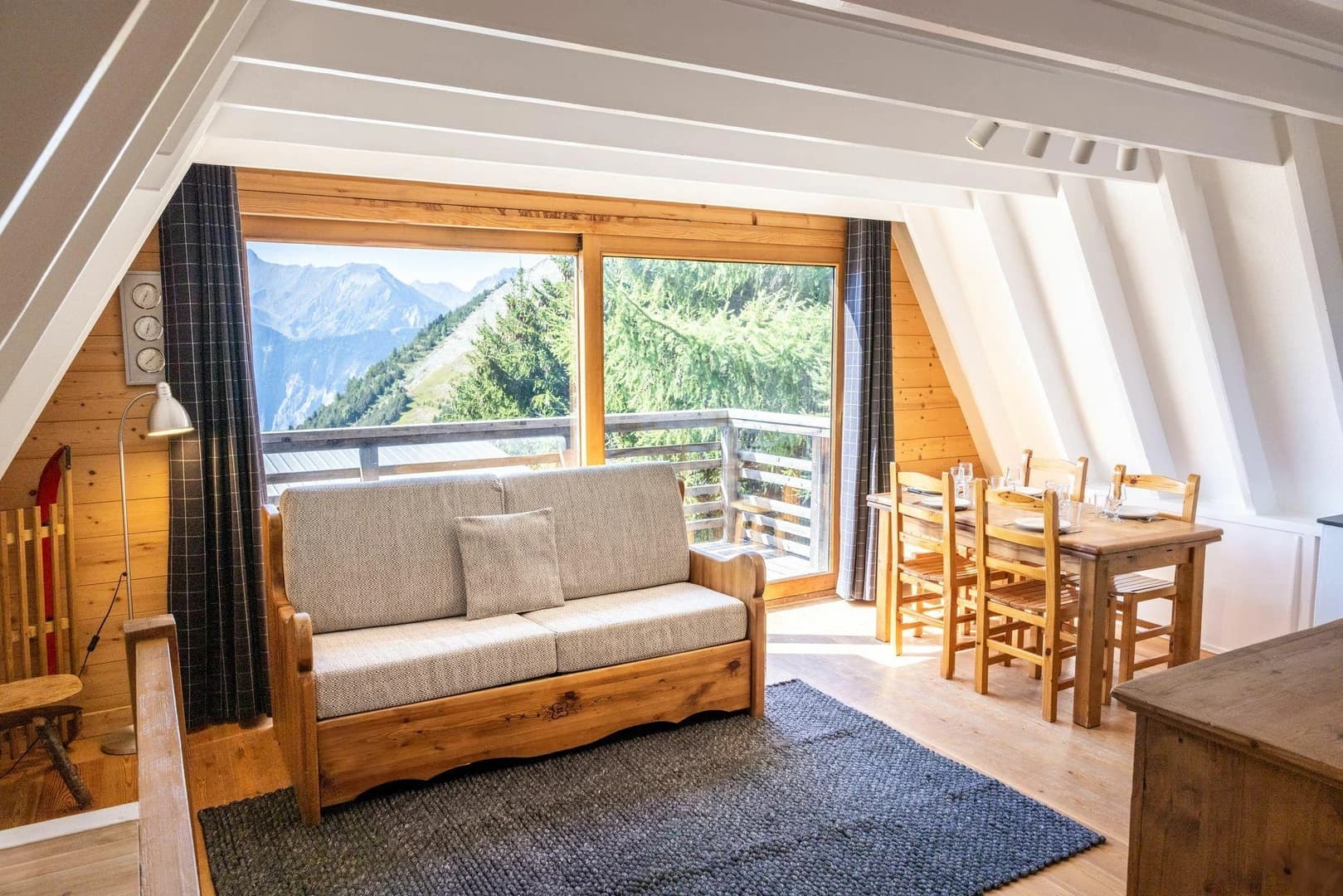 Facing south, the chalet’s terrace provides stunning views of the surrounding mountains, perfect for enjoying the sun and alpine scenery.