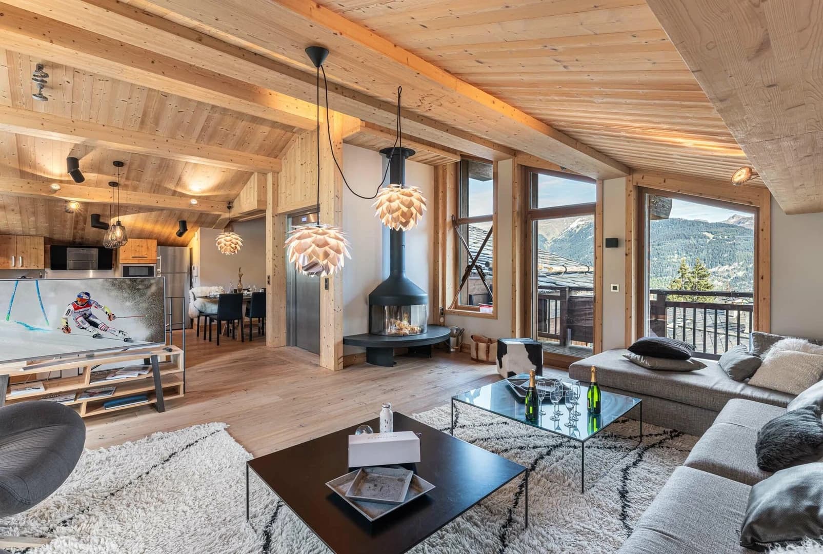 Chalet Eiger is situated in the peaceful Brigues area of Courchevel Village, offering both tranquility and convenient proximity to the ski slopes. This semi-detached 272m² chalet embodies a chic mountain charm, with its open-plan living area featuring a cozy living room, dining space, and fully equipped kitchen, all centered around a fireplace that radiates warmth throughout. The interior design, characterized by blonde wood, clean lines, and natural tones, creates a welcoming and serene ambiance.