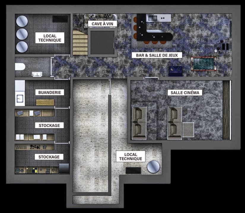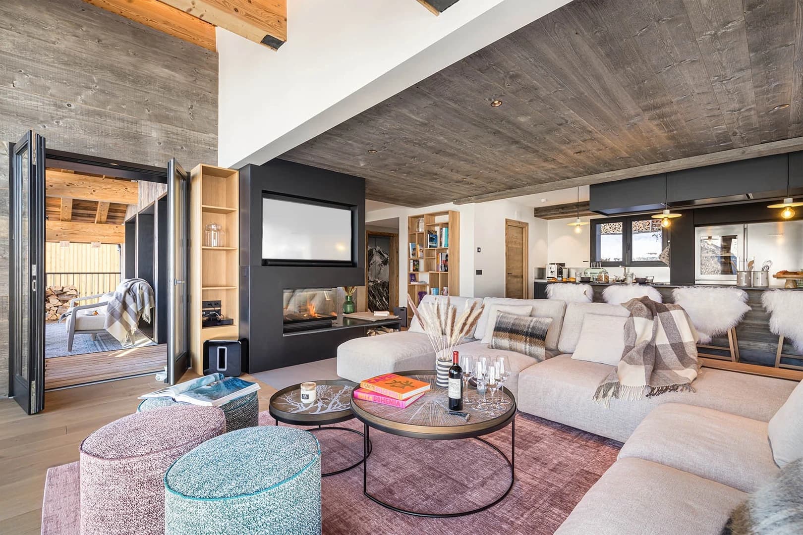 The lower levels are dedicated to wellness and leisure, offering a private indoor pool with counter-current system, a hammam, and a massage room. A stylish bar and games room create the perfect atmosphere for entertaining and relaxing after a day on the slopes.