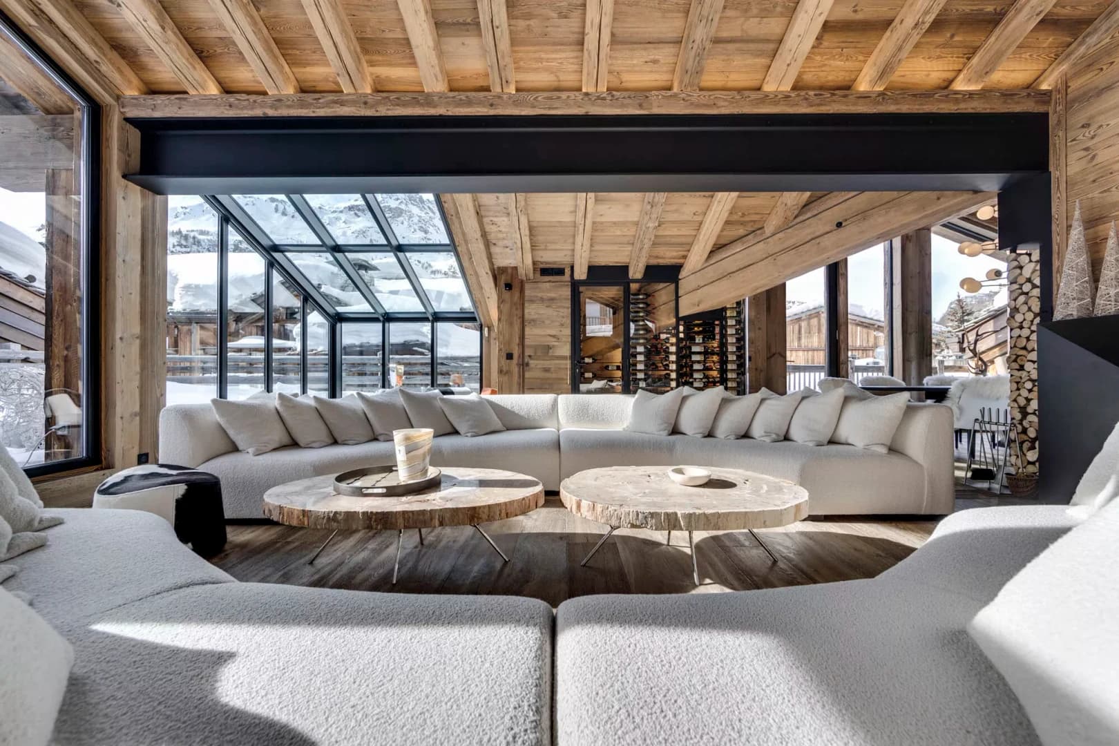 The expansive living room, the chalet’s centerpiece, boasts a glass roof that floods the space with natural light, highlighting the harmonious blend of wood and modern finishes. Its generous layout encourages both relaxation and socializing, while offering breathtaking views of the village and surrounding peaks.