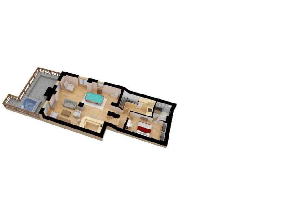 The ground floor features a generous relaxation space with billiards, a bar, and cosy armchairs, complemented by an outdoor Jacuzzi on the terrace offering breathtaking views of the Dent de Burgin. Three bedrooms with private bathrooms are also located on this level. The upper floor unveils a spectacular living area with large bay windows, a unique central fireplace, and chic contemporary furnishings, creating a cosy and zen atmosphere. The stylish dining space with a long wooden table and striking suspended lights adjoins a modern, fully equipped kitchen with a sleek black and white worktop, designed as both a culinary hub and a convivial meeting place.