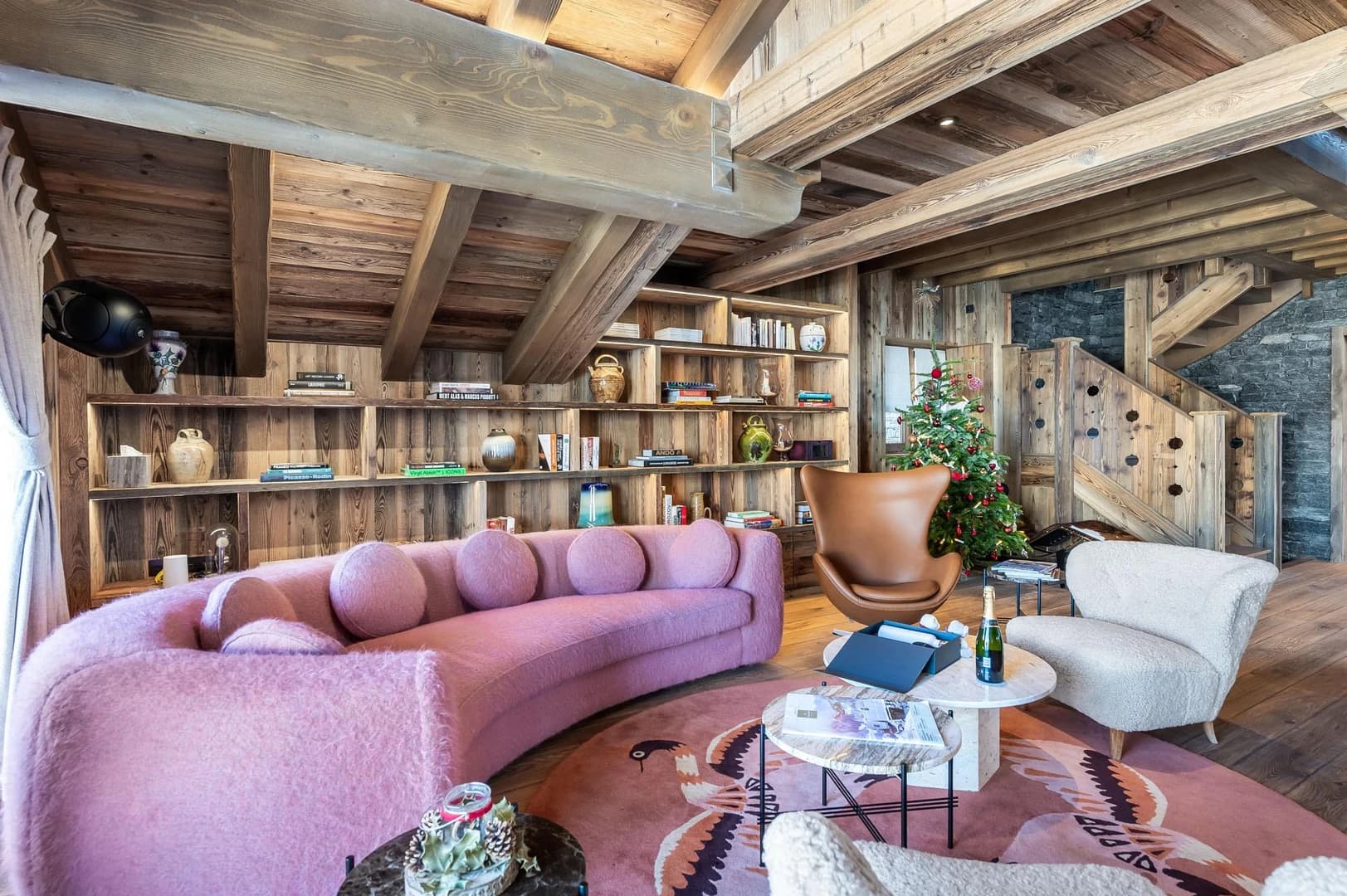 Enjoy a bright double-height living room with mountain views, a cosy fireplace, and a long dining table for family meals. The chalet combines authentic alpine wood with modern stone finishes for a refined atmosphere.