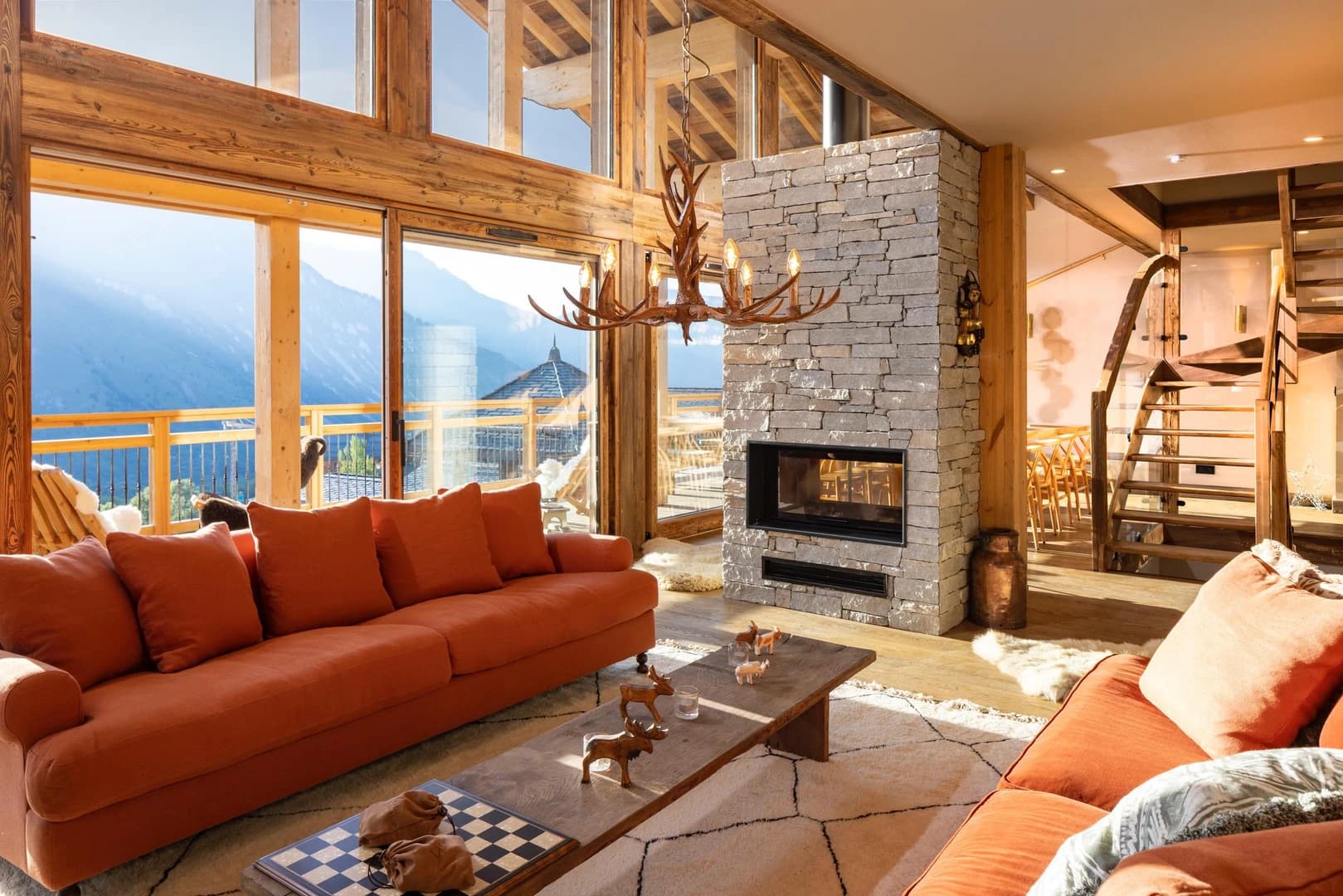 With 200 m² of living space and a capacity of 12 guests, the chalet features 5 bedrooms and 5 bathrooms, including a suite with dressing room and terrace, four double en-suite bedrooms, and a children’s dormitory for 4. The open-plan living area includes a kitchen, dining room, and lounge centered around a glass-sided fireplace. A cathedral ceiling and large windows fill the space with light and showcase the landscape. A surrounding balcony provides panoramic views of the mountains and sunsets, facing west.