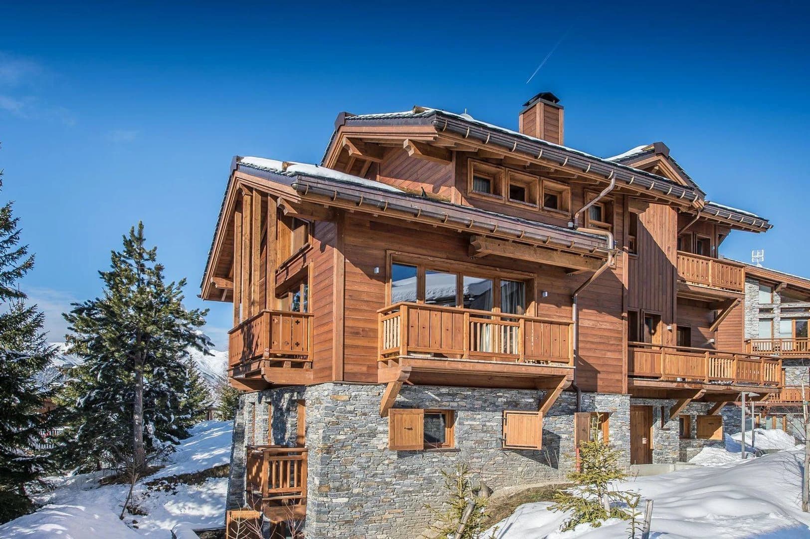 Accommodating 10 adults in five en-suite bedrooms, including two master suites with balconies, the chalet features spacious living areas, a central fireplace, and a library lounge.