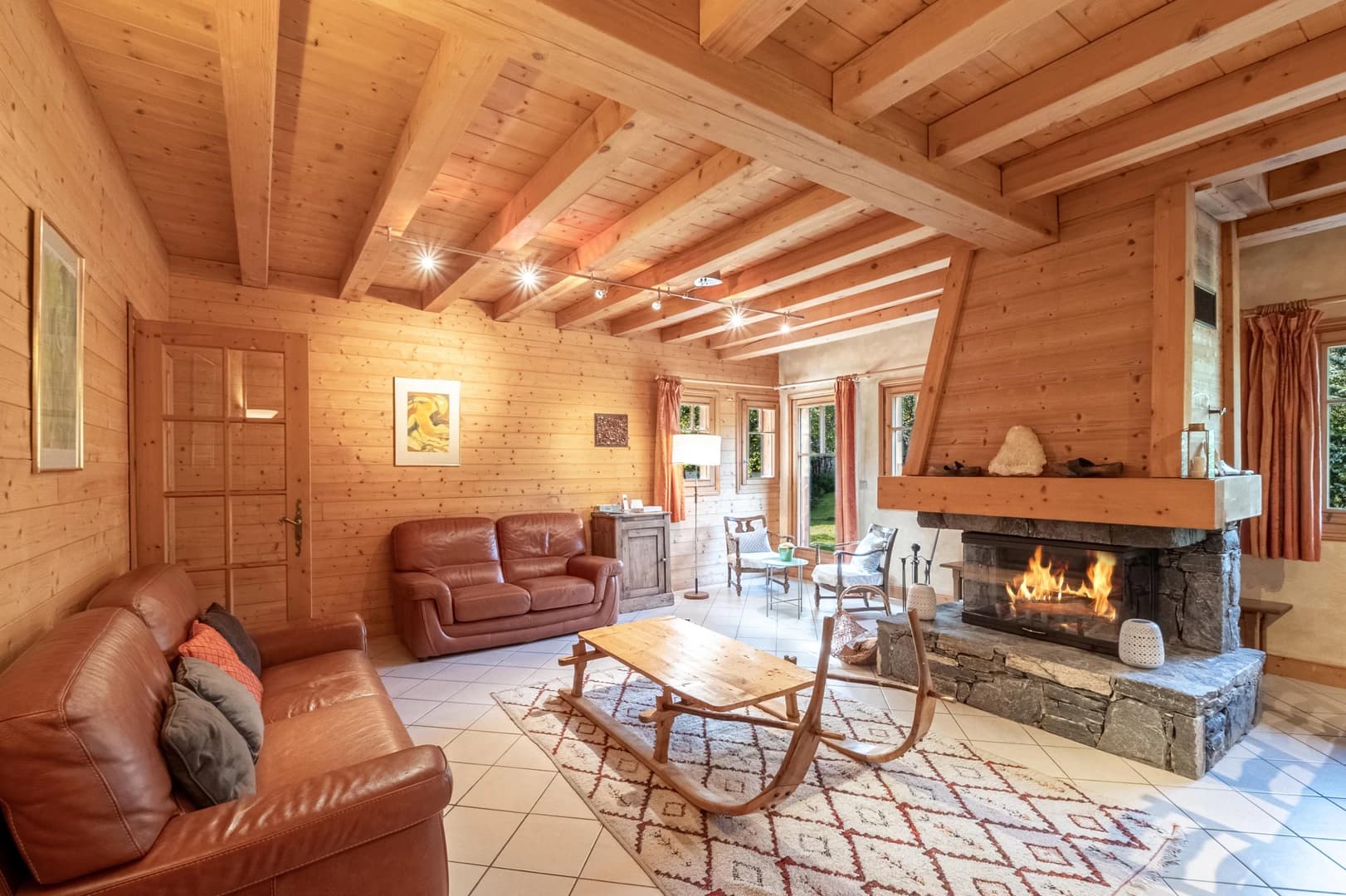 Built with character and charm, the chalet features authentic materials such as wood and stone, particularly showcased around the central fireplace, creating a warm and inviting alpine atmosphere. Generous living spaces enhance comfort and make it an ideal retreat for larger groups.