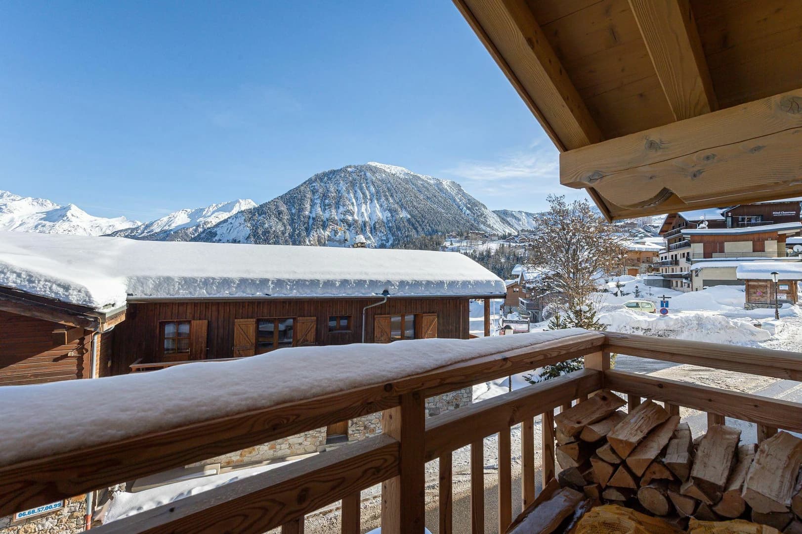 The chalet features a stunning master suite with a desk and en-suite bathroom, four beautifully appointed double bedrooms, and a cozy mountain corner with two bunk beds. The open-plan living area, with its fully equipped kitchen and inviting lounge, is bathed in natural light, offering breathtaking mountain views.