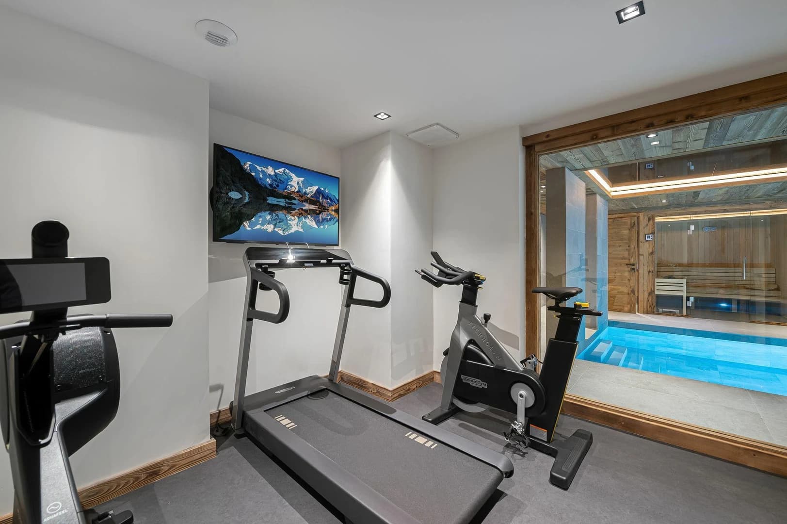 Designed for ultimate well-being, the chalet’s first floor wellness area features an indoor swimming pool, a sauna, and a massage room, providing a sanctuary for post ski relaxation. A fully equipped gym caters to those wanting to stay active, while the cozy TV lounge invites you to unwind in comfort.