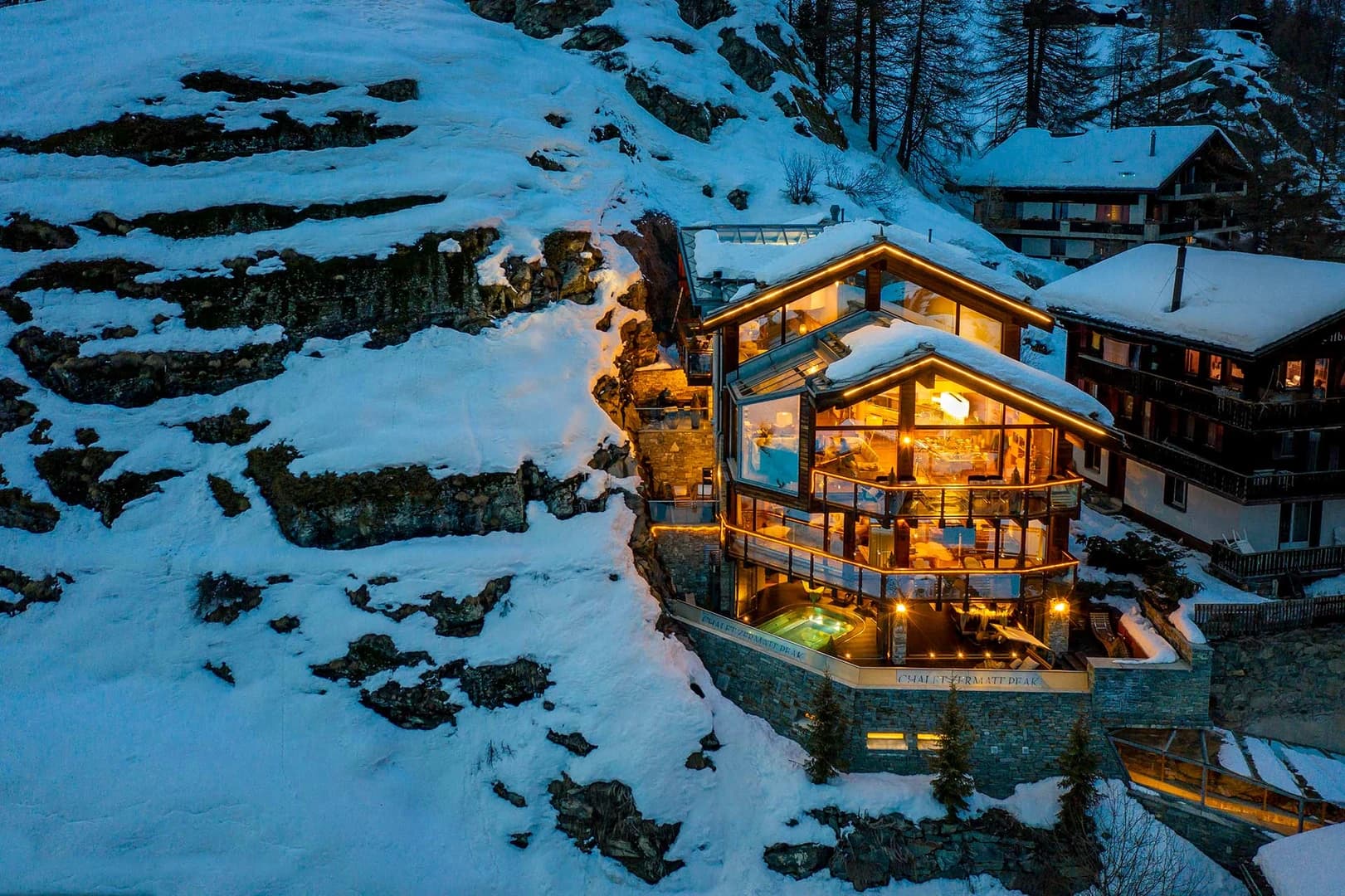 The Zermatt Peak Chalet unfolds over six lavish floors, offering five deluxe double bedroom suites, floor-to-ceiling windows, a sky observatory roof, and an indoor/outdoor Jacuzzi.