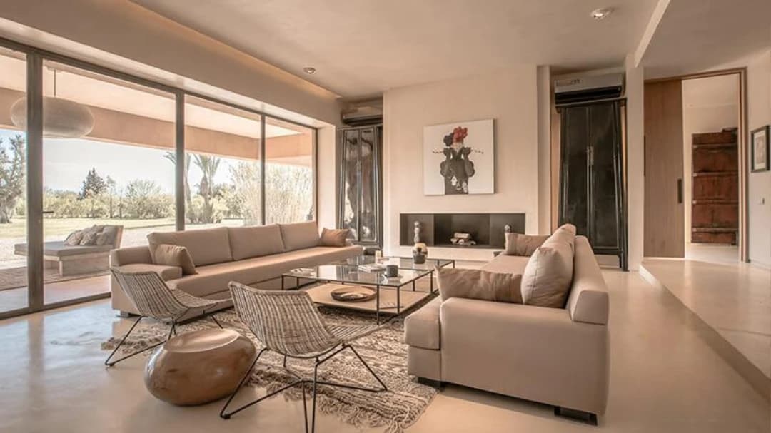 Designed with contemporary architecture that combines clean lines and minimalist sophistication, the villa features eight spacious suites, six in the main residence, including a grand master suite, and two additional suites with a private living room in an independent guest pavilion. The interiors are a refined fusion of modern design and traditional craftsmanship, enriched with elegant African-inspired details. Expansive terraces invite guests to admire panoramic views of the gardens and the majestic Atlas Mountains, while large patios fill the living spaces with natural light, blurring the boundaries between indoors and outdoors.