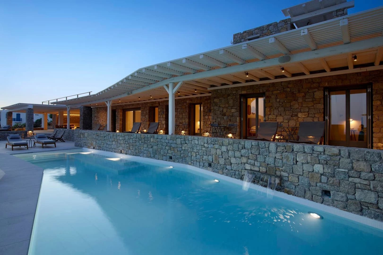 The villa features 10 independent suites, each with an en-suite bathroom, sea or pool view, and private entrance. For relaxation, a full spa room includes a steam room, massage room, foot spa, and indoor Jacuzzi, offering a private wellness retreat.